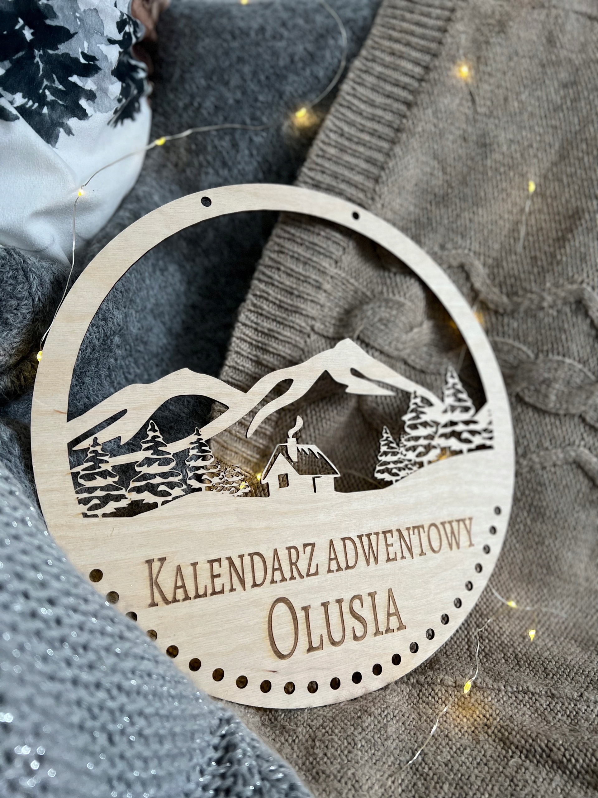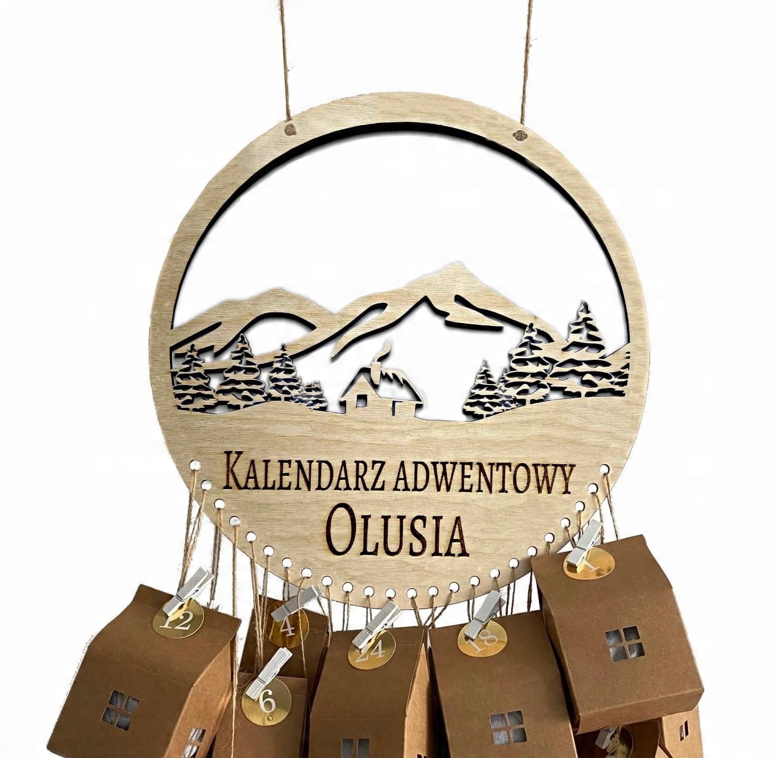 Zestaw nie zawiera domków Kraft (zawieszek i sznurków). Przedmiotem aukcji jest wyłącznie drewniana baza kalendarza adwentowego.