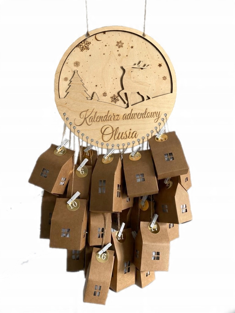 Zestaw NIE ZAWIERA domków Kraft (zawieszek i sznurków). Przedmiotem aukcji jest WYŁĄCZNIE DREWNIANA BAZA kalendarza adwentowego.