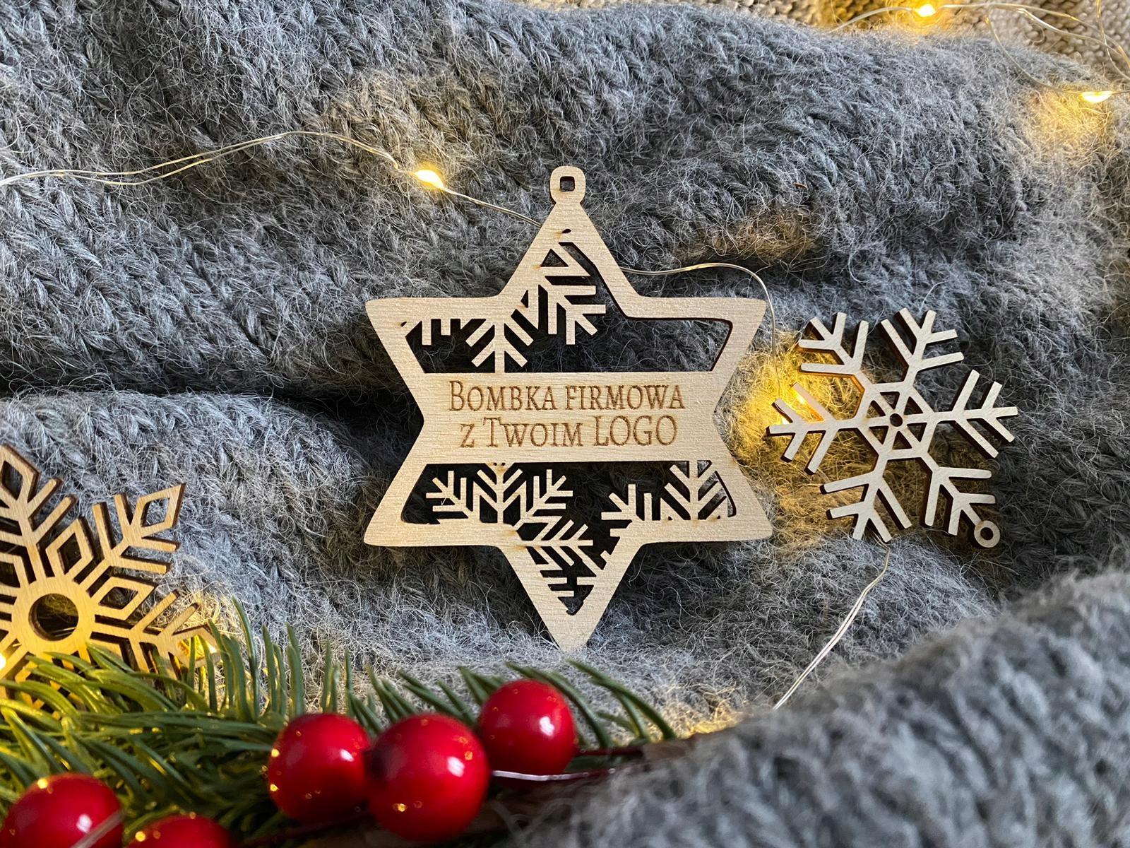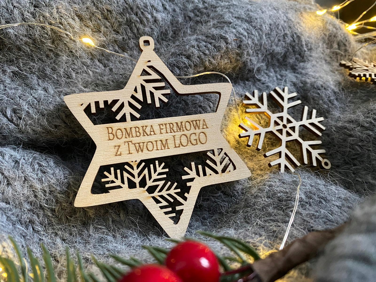 DREWNIANA BOMBKA z logo firmy na choinkę GWIAZDKA