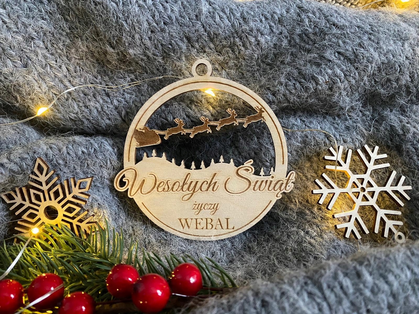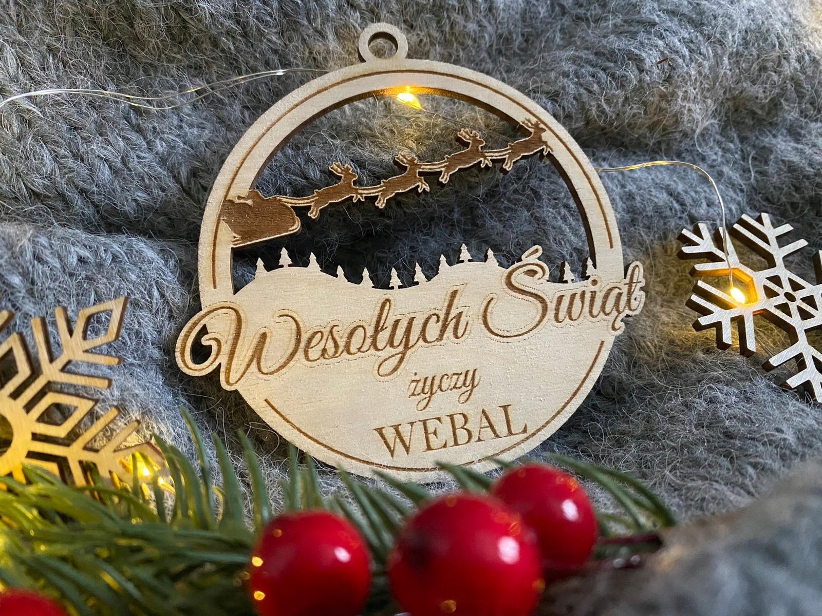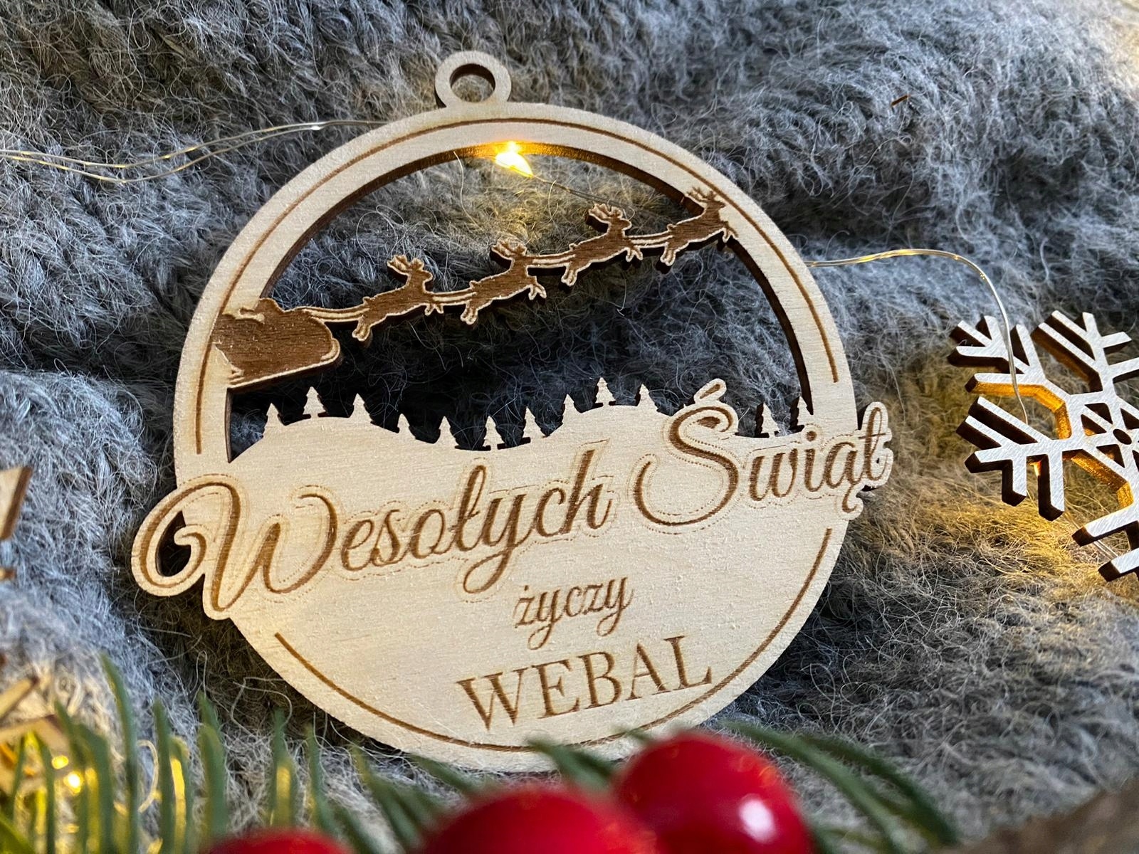 DREWNIANA BOMBKA z logo firmy na choinkę ŚWIĘTA