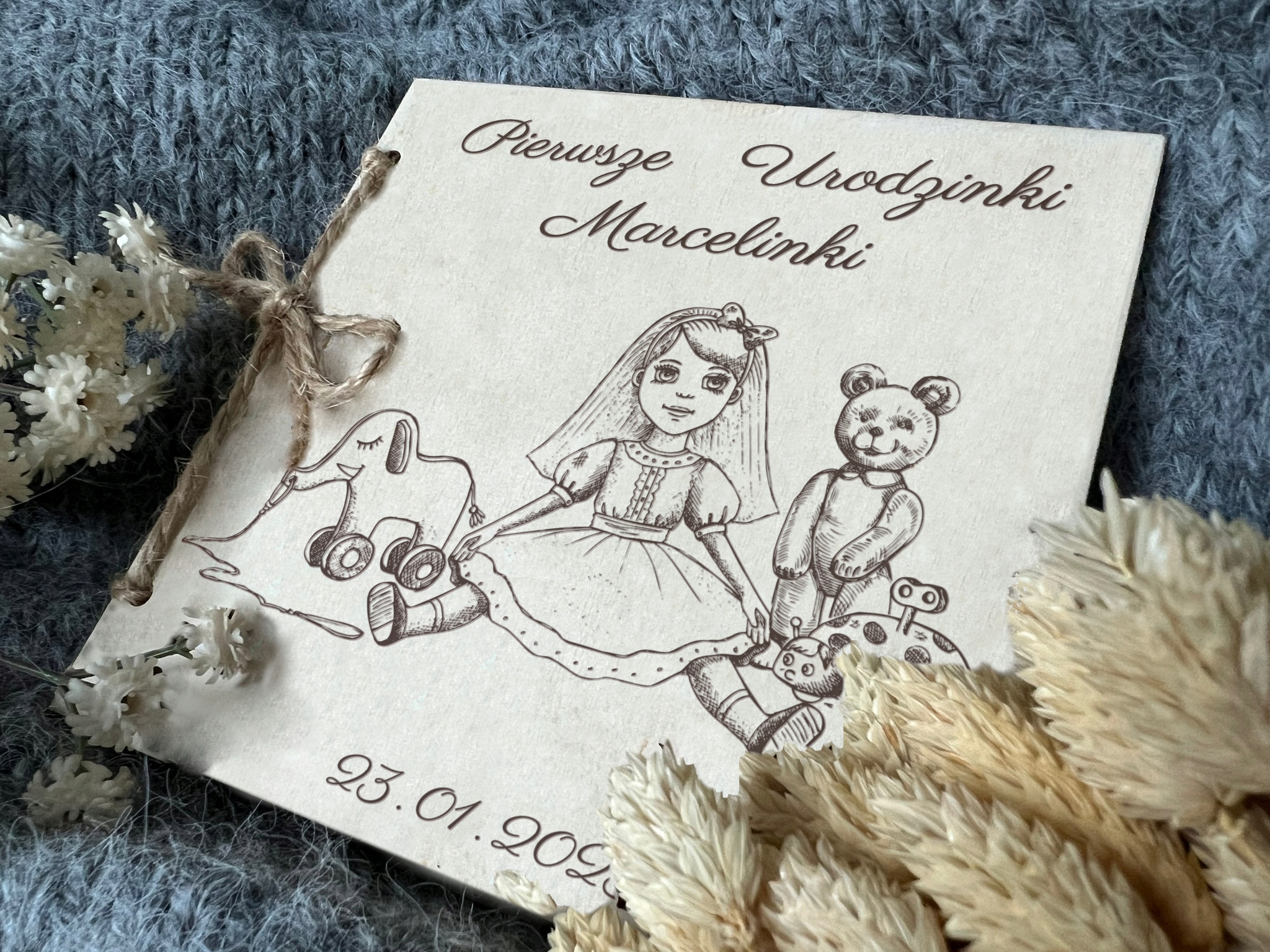 Pamiątka składa się z dwóch drewnianych kartek związanych sznurkiem jutowym. Kartka 1 zdobiona głębokim grawerem laserowym w postaci GRAFIKI oraz podpisu ” Pierwsze Urodzinki + Imię dziecka + data” (WZÓR OKREŚLONY wg. zdjęcia po lewej stronie).