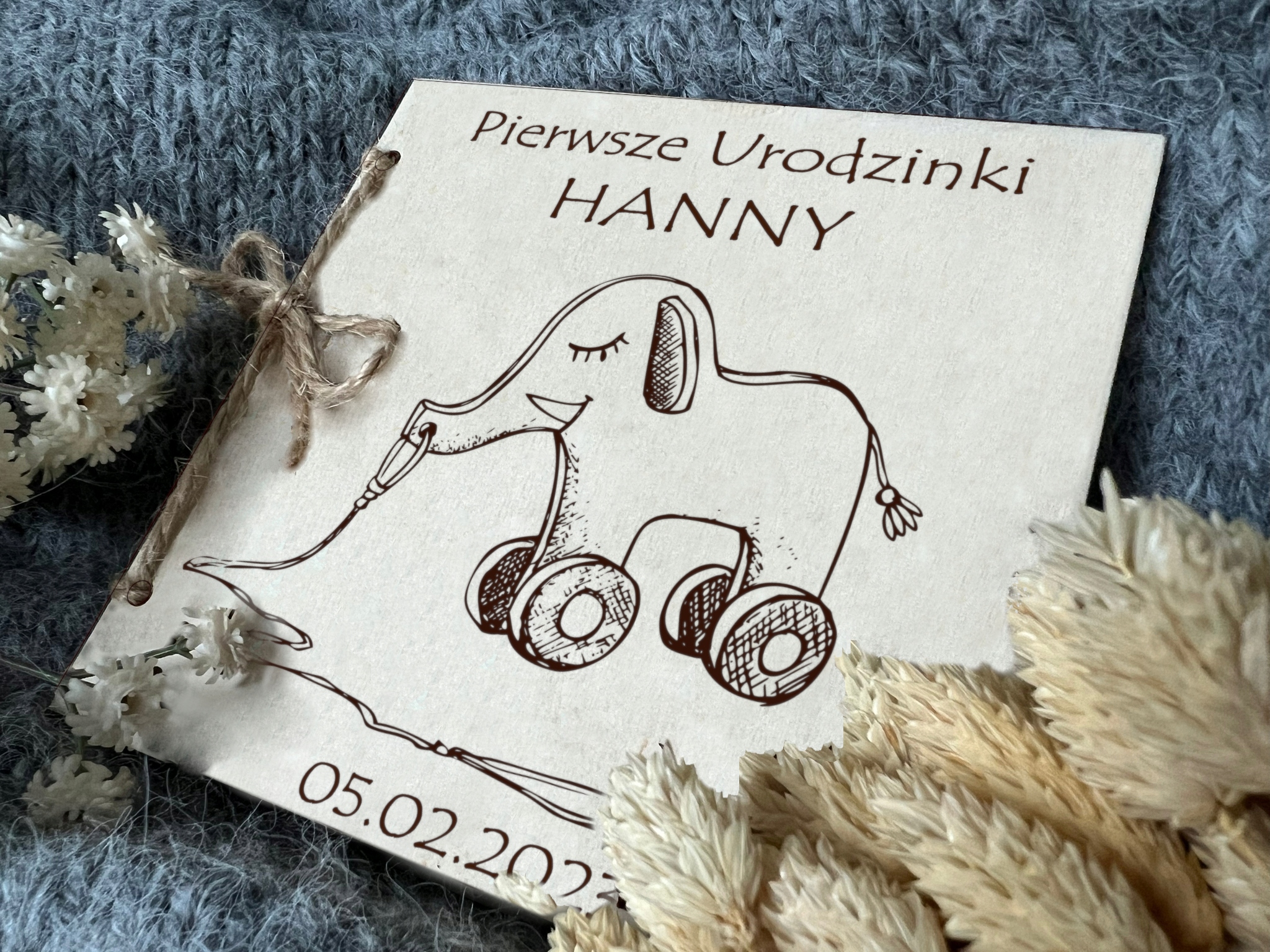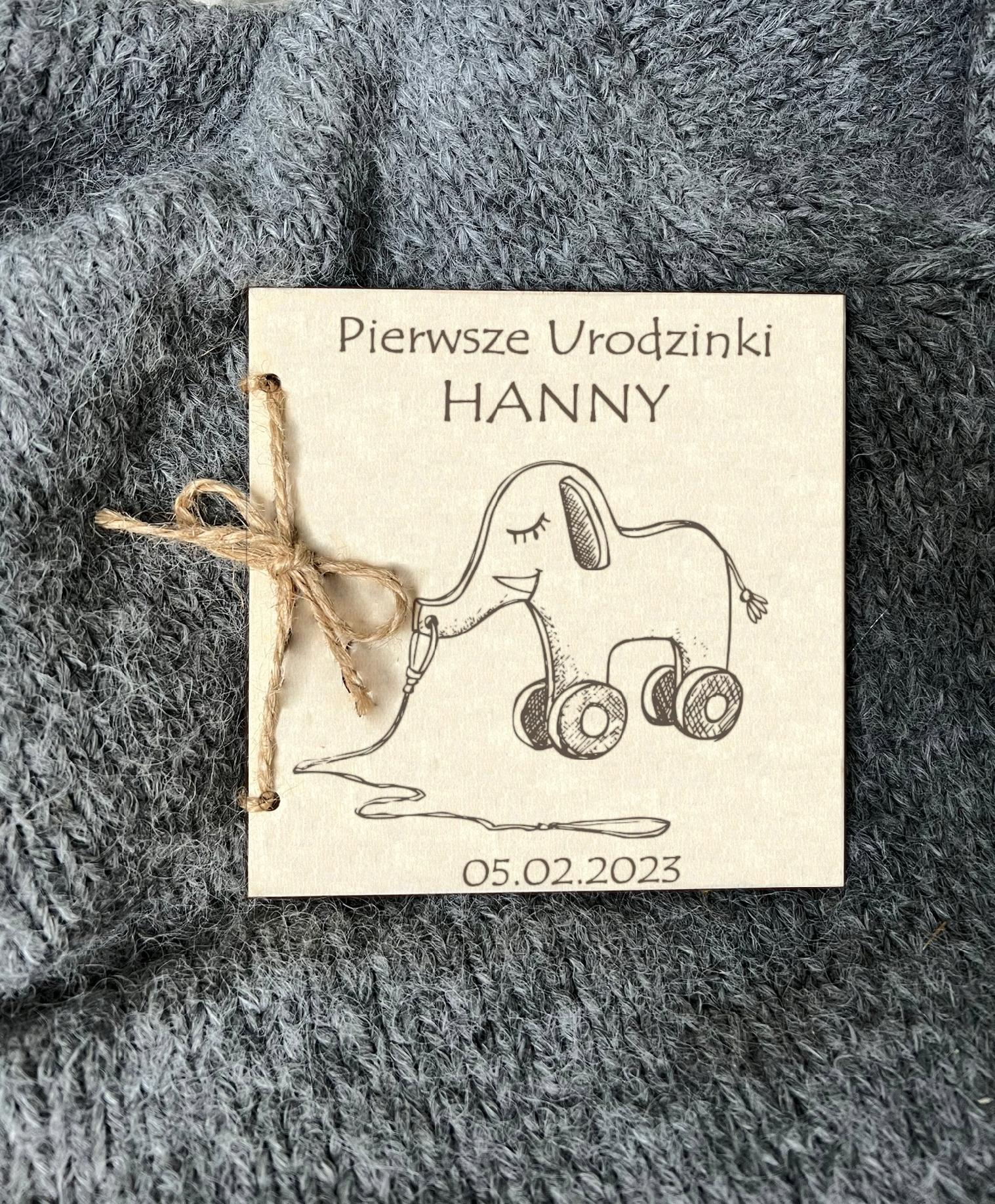 Drewniana Kartka na roczek z życzeniami Urodziny