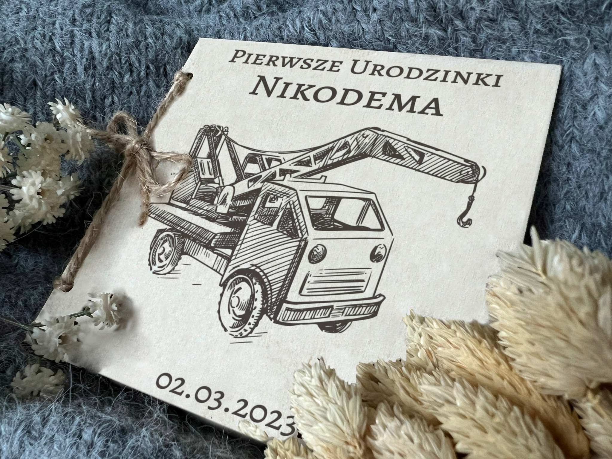 Pamiątka składa się z dwóch drewnianych kartek związanych sznurkiem jutowym. Kartka 1 zdobiona głębokim grawerem laserowym w postaci GRAFIKI oraz podpisu ” Pierwsze Urodzinki + Imię dziecka + data” (WZÓR OKREŚLONY wg. zdjęcia po lewej stronie).
