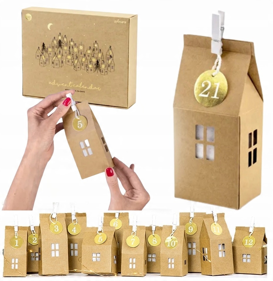 - 3 wzory papierowych domków w kolorze kraft, po 8 z każdego wzoru (wymiary: od ok. 5 x 11 x 5 cm do ok. 7 x 11 x 5 cm),