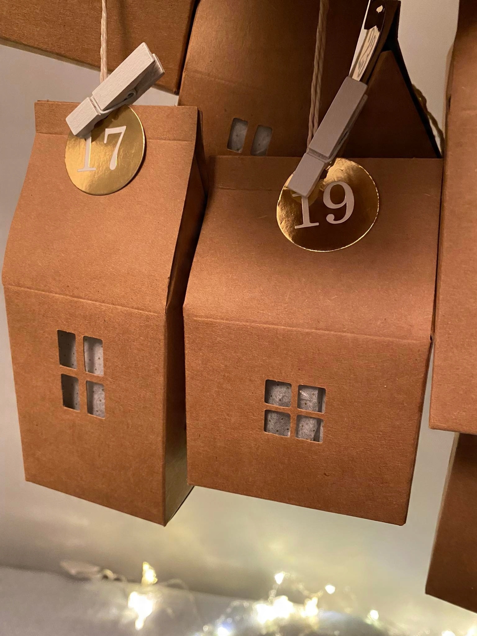 - złote papierowe zawieszki z nadrukowanymi białymi cyframi od 1 do 24,