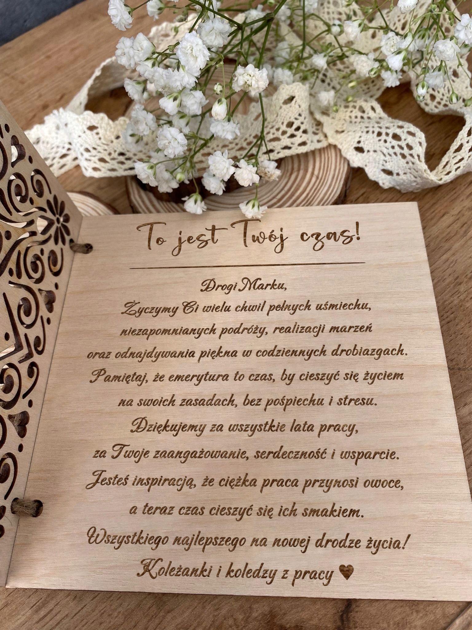 Wykonana z należytą starannością i dbałością o każdy szczegół. Wewnątrz znajduje się kartka grawerowana laserowo z życzeniami spersonalizowana przez Państwa lub z gotowego projektu. tj.: