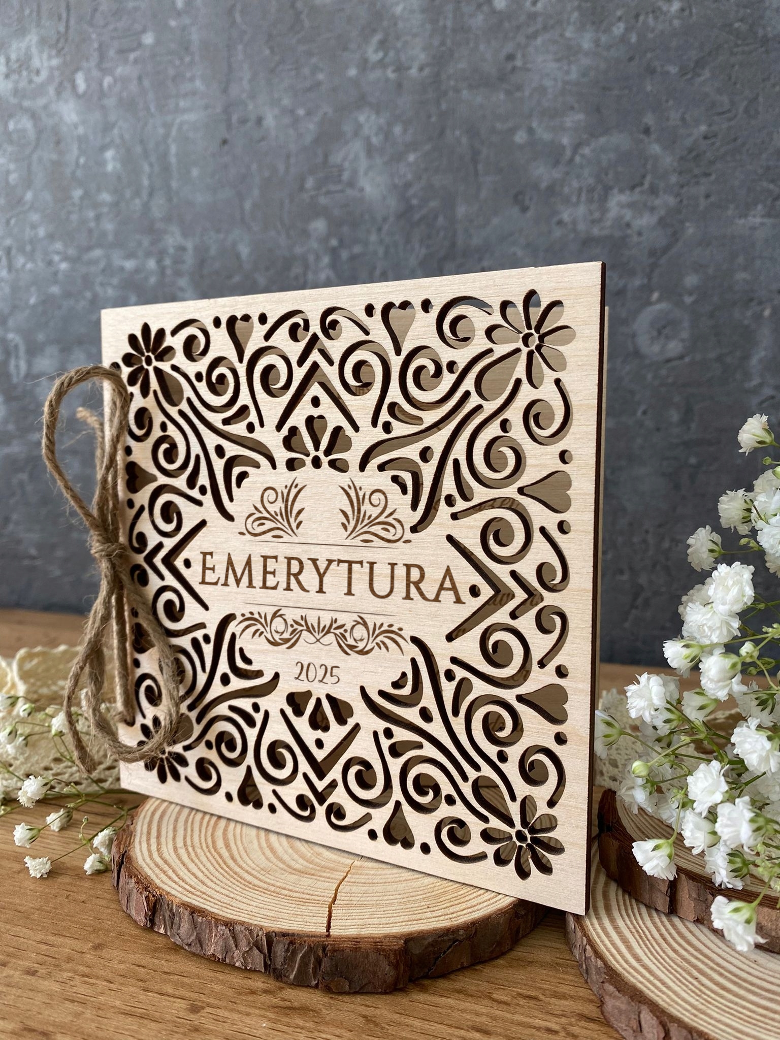 Karta zdobiona głębokim grawerem laserowym w postaci napisu ” EMERYTURA Gratulacje!” (WZÓR OKREŚLONY wg. zdjęcia).