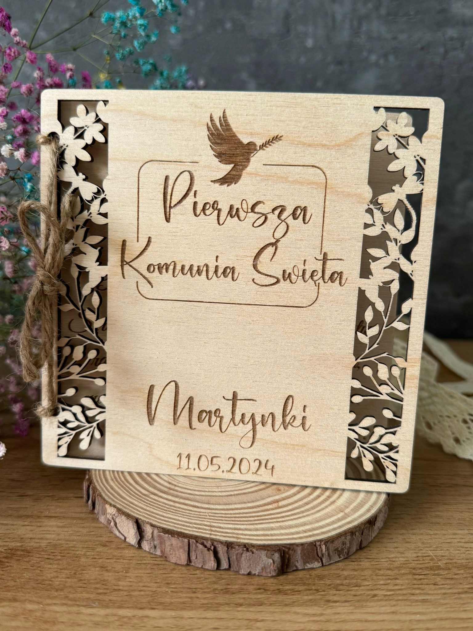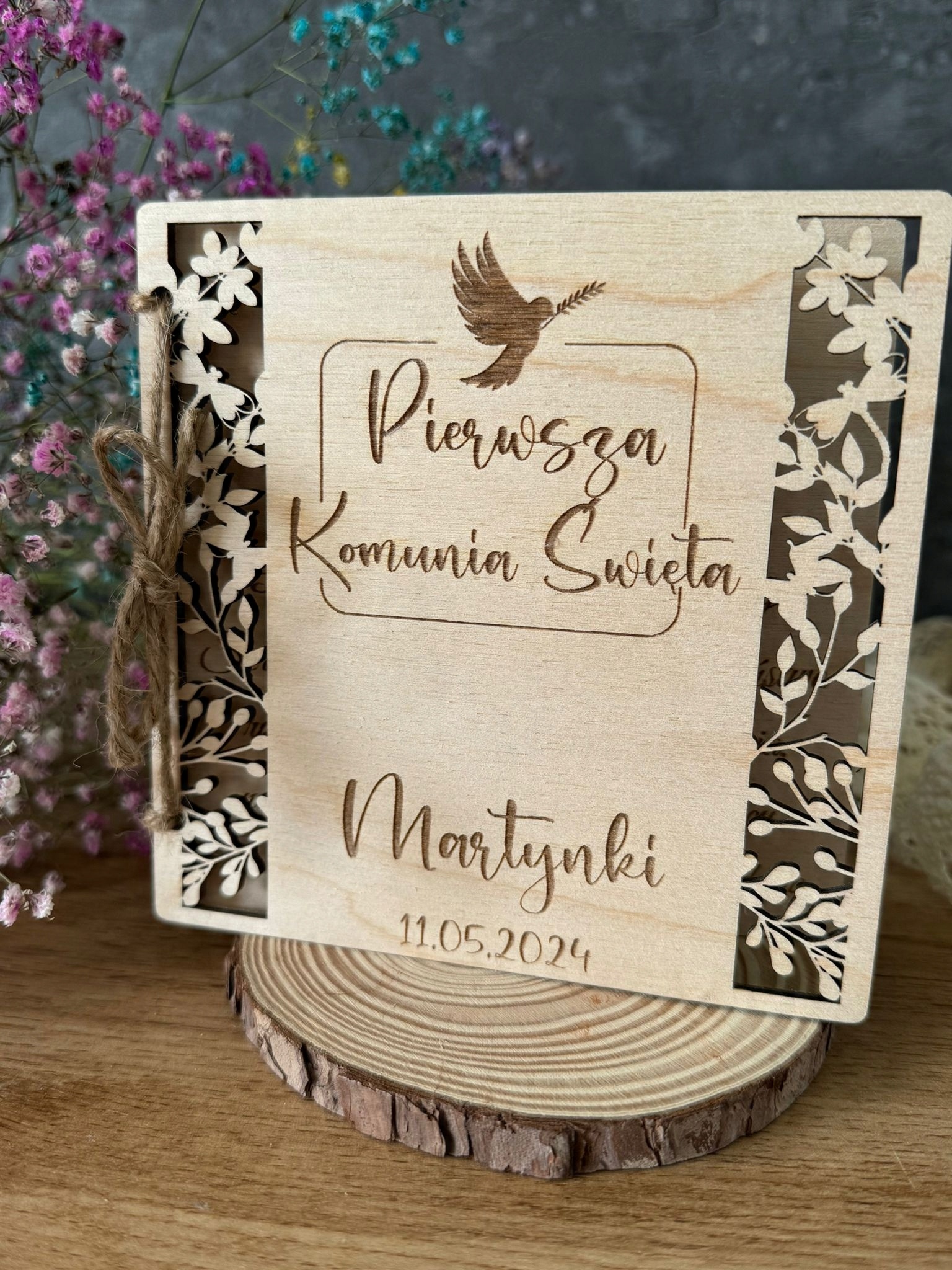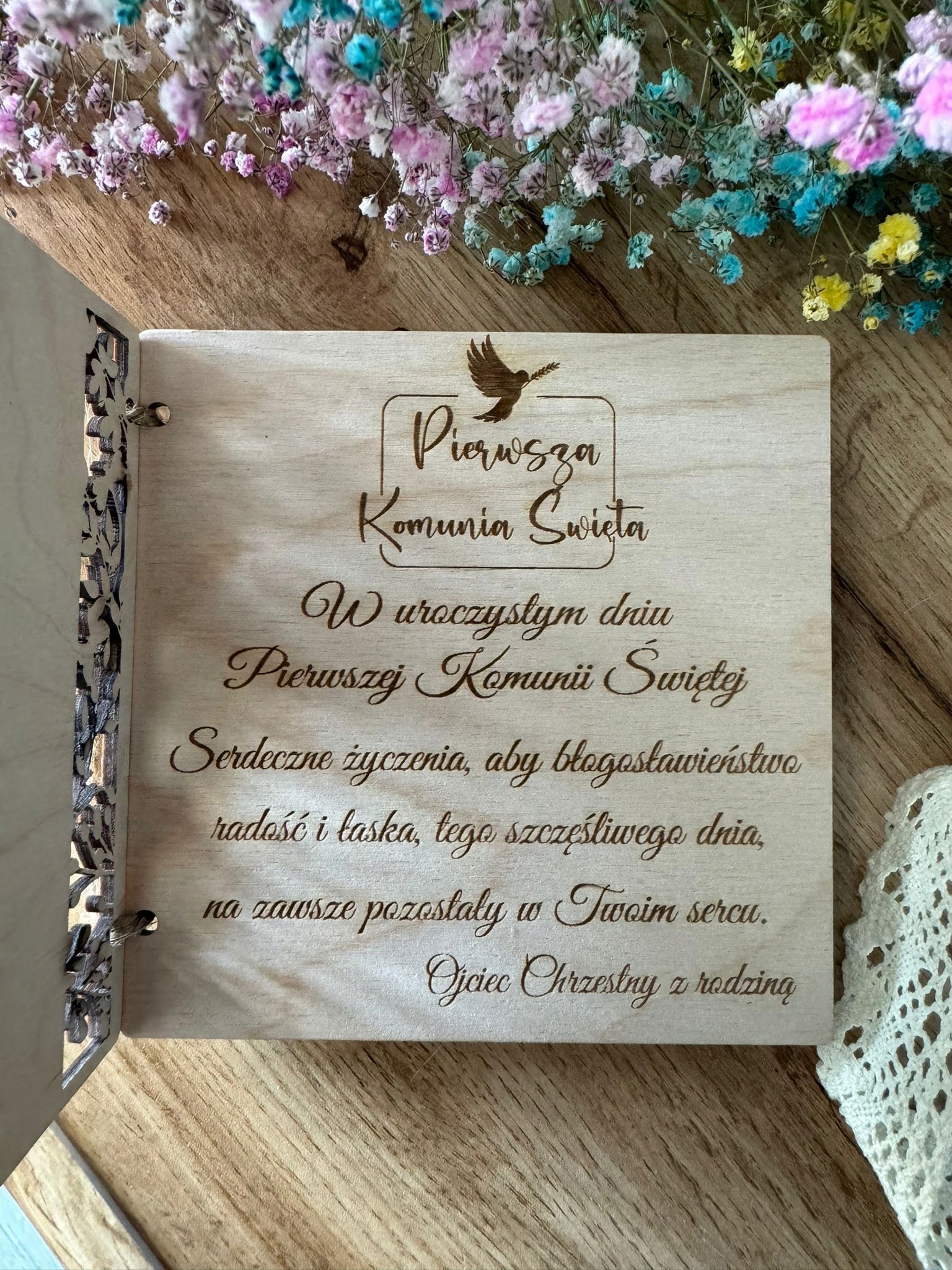 KARTKA NA KOMUNIĘ PAMIĄTKA PIERWSZEJ KOMUNII ŚWIĘTEJ PERSONALIZACJA DREWNO