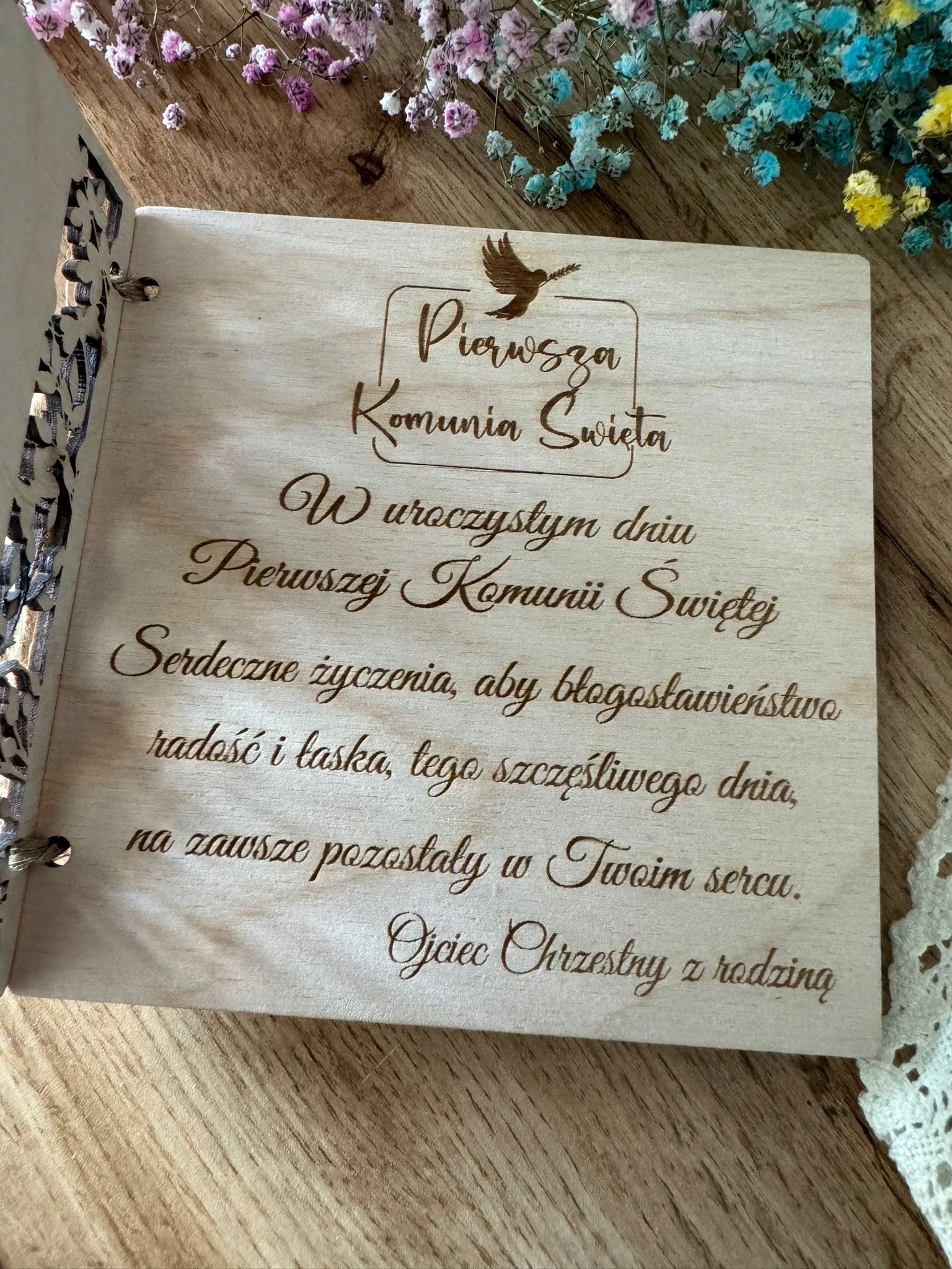 KARTKA NA KOMUNIĘ PAMIĄTKA PIERWSZEJ KOMUNII ŚWIĘTEJ PERSONALIZACJA DREWNO
