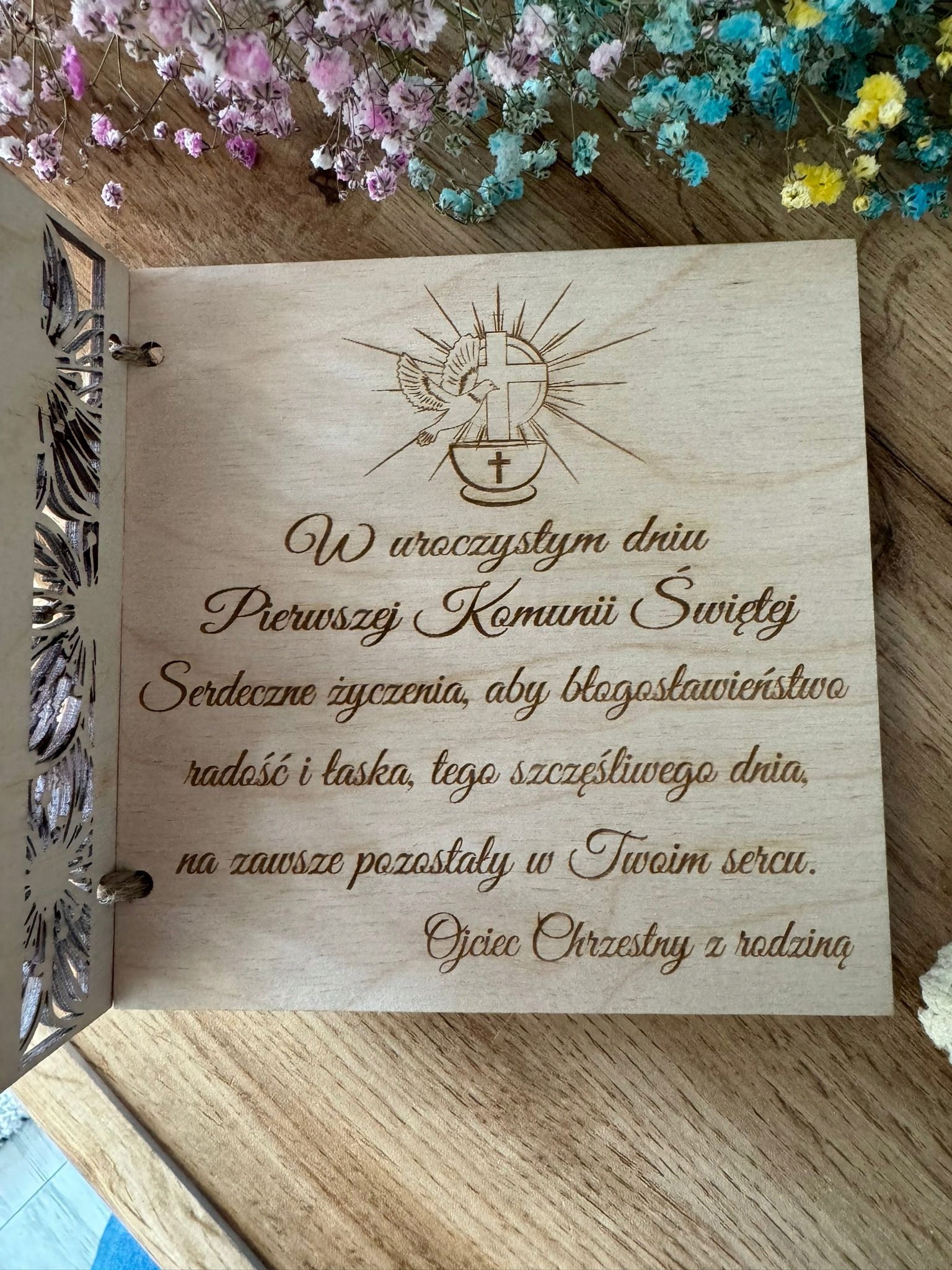 KARTKA NA KOMUNIĘ PAMIĄTKA PIERWSZEJ KOMUNII ŚWIĘTEJ PERSONALIZACJA DREWNO