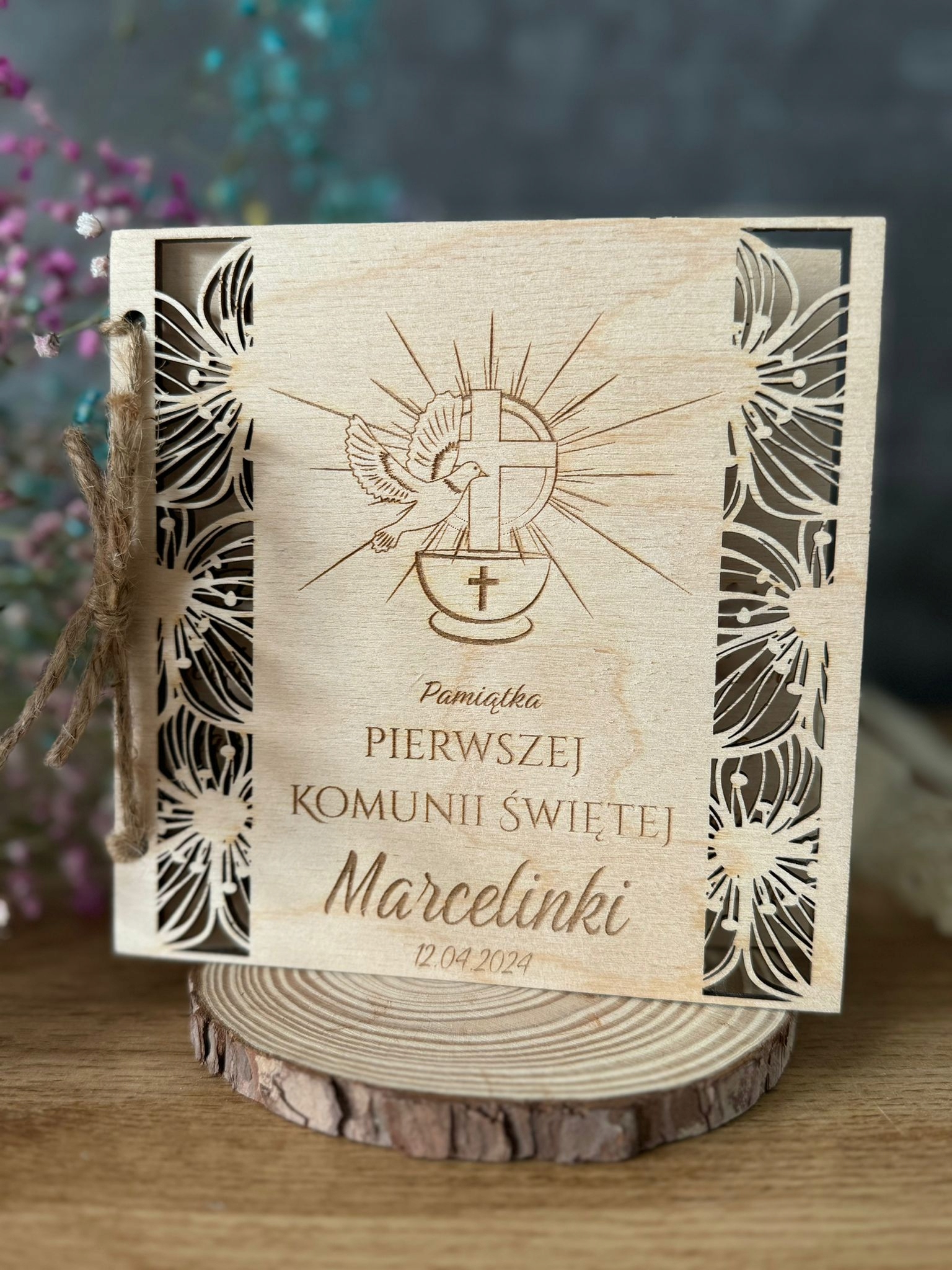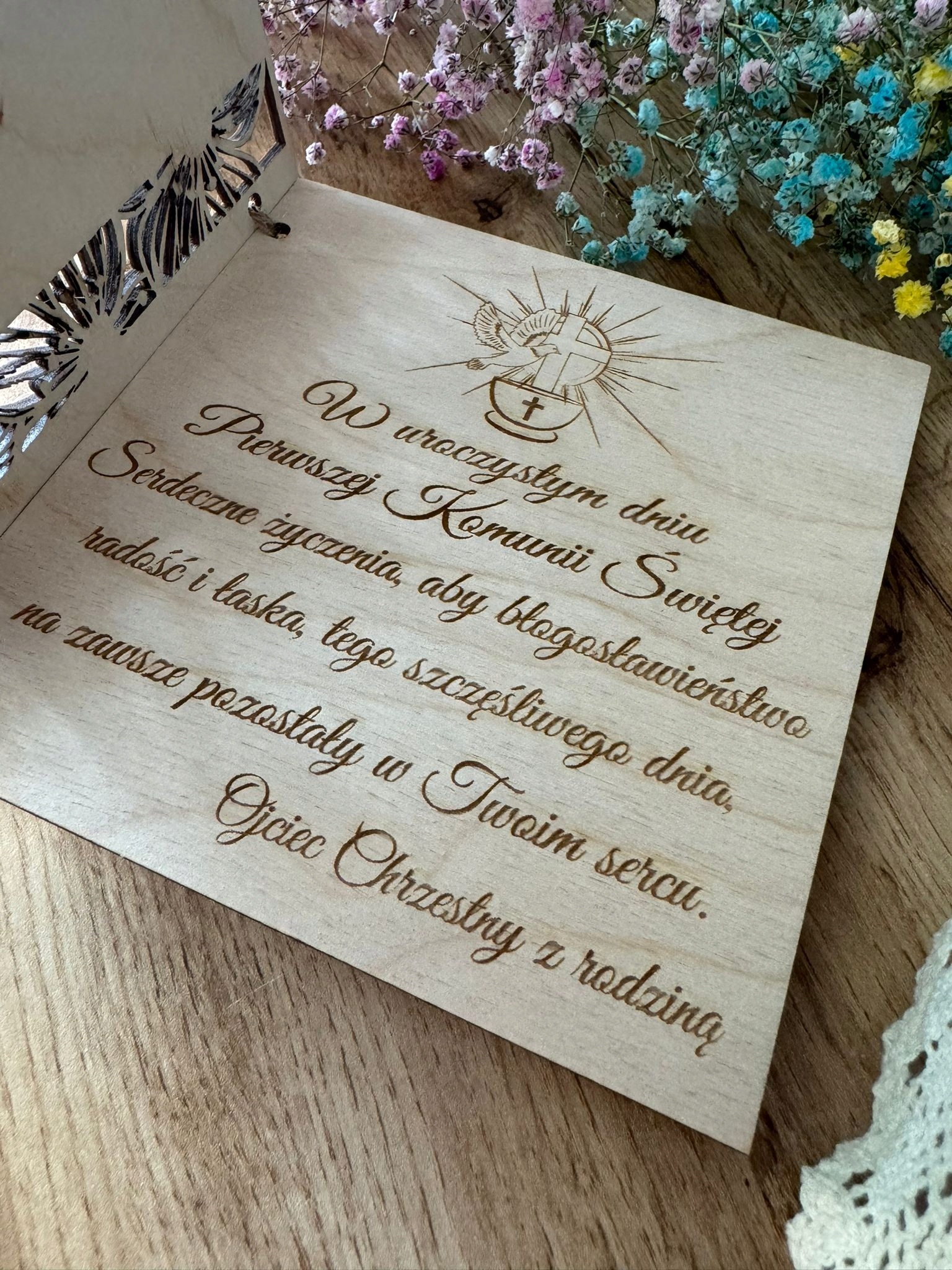 KARTKA NA KOMUNIĘ PAMIĄTKA PIERWSZEJ KOMUNII ŚWIĘTEJ PERSONALIZACJA DREWNO