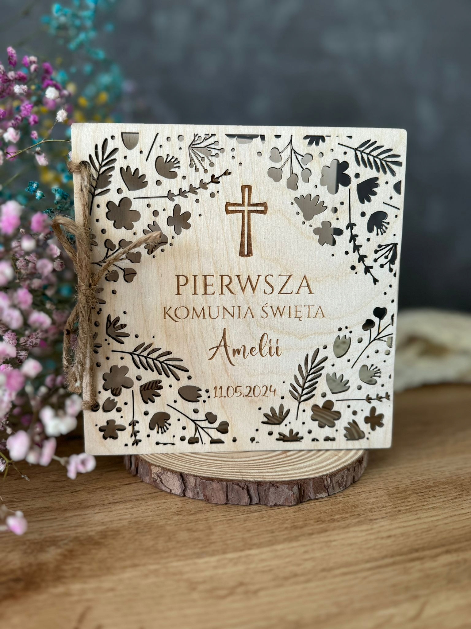 KARTKA NA KOMUNIĘ PAMIĄTKA PIERWSZEJ KOMUNII ŚWIĘTEJ PERSONALIZACJA DREWNO