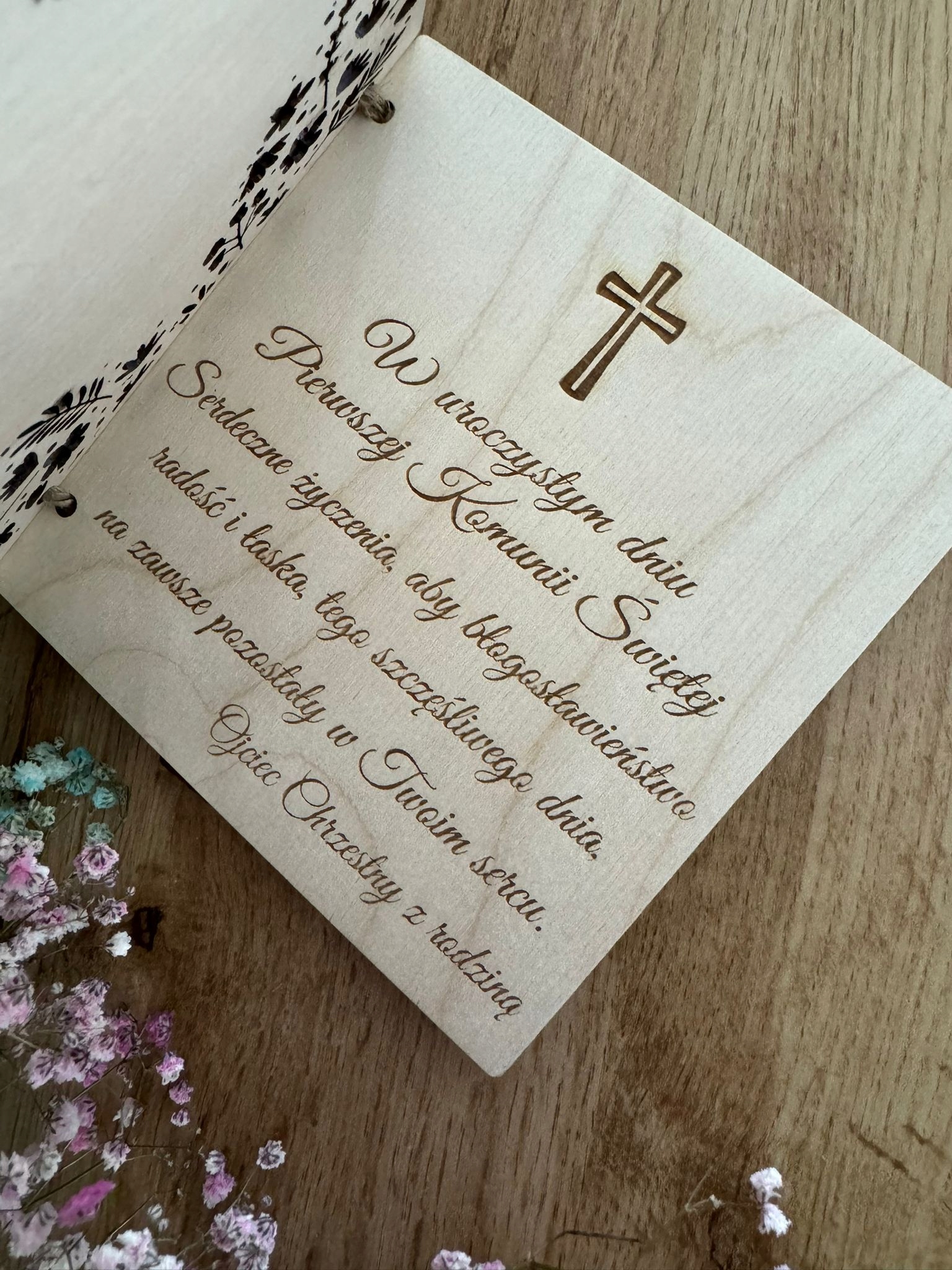 KARTKA NA KOMUNIĘ PAMIĄTKA PIERWSZEJ KOMUNII ŚWIĘTEJ PERSONALIZACJA DREWNO