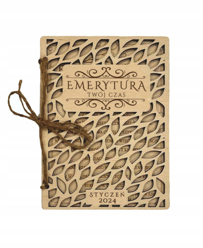 Karta zdobiona głębokim grawerem laserowym w postaci GRAFIKI oraz podpisu ” EMERYTURA Twój Czas” (WZÓR OKREŚLONY wg. zdjęcia po lewej stronie).