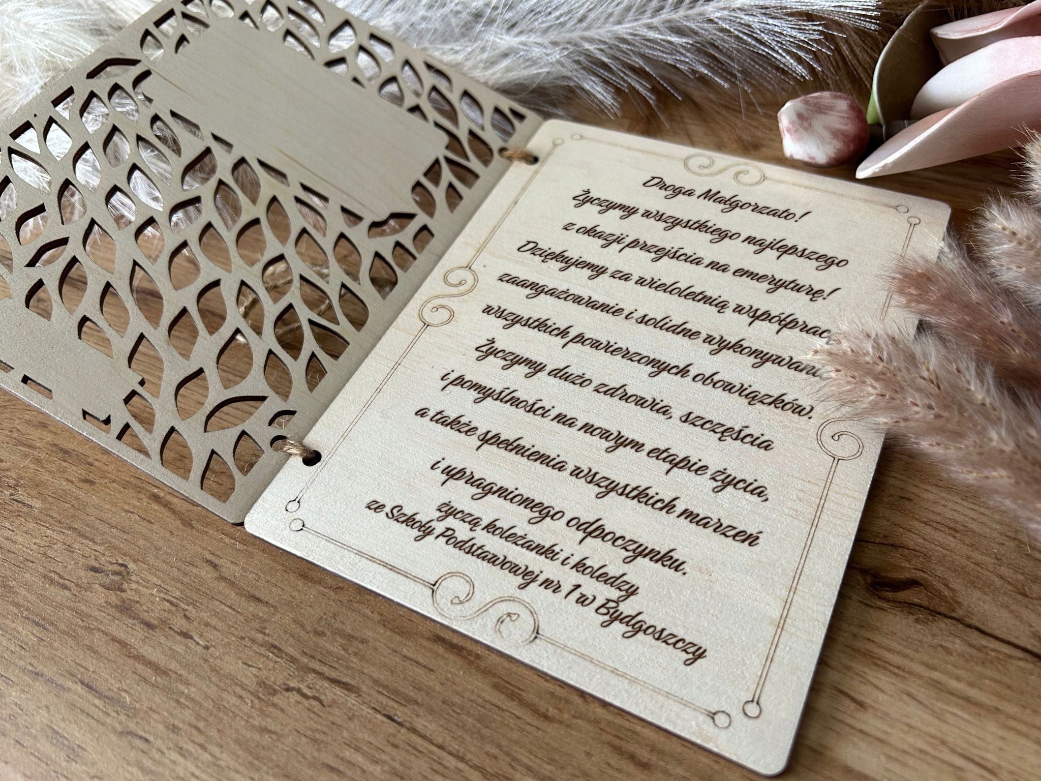 Wykonana z należytą starannością i dbałością o każdy szczegół. Wewnątrz znajduje się kartka grawerowana laserowo z grafiką i życzeniami spersonalizowana przez Państwa lub z gotowego projektu. tj.: