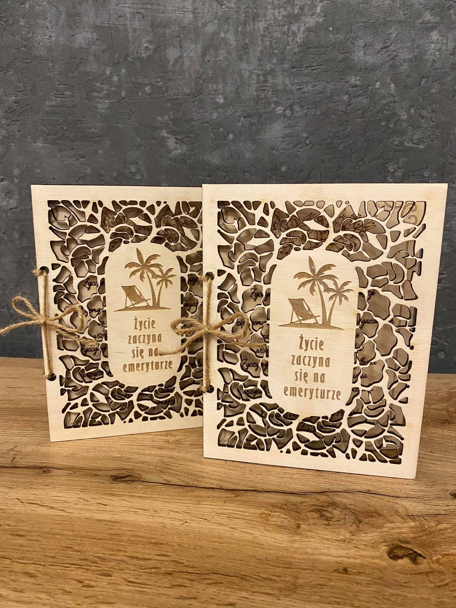 Karta zdobiona głębokim grawerem laserowym w postaci GRAFIKI oraz podpisu ” Życie zaczyna się na emeryturze” (WZÓR OKREŚLONY wg. zdjęcia po lewej stronie).