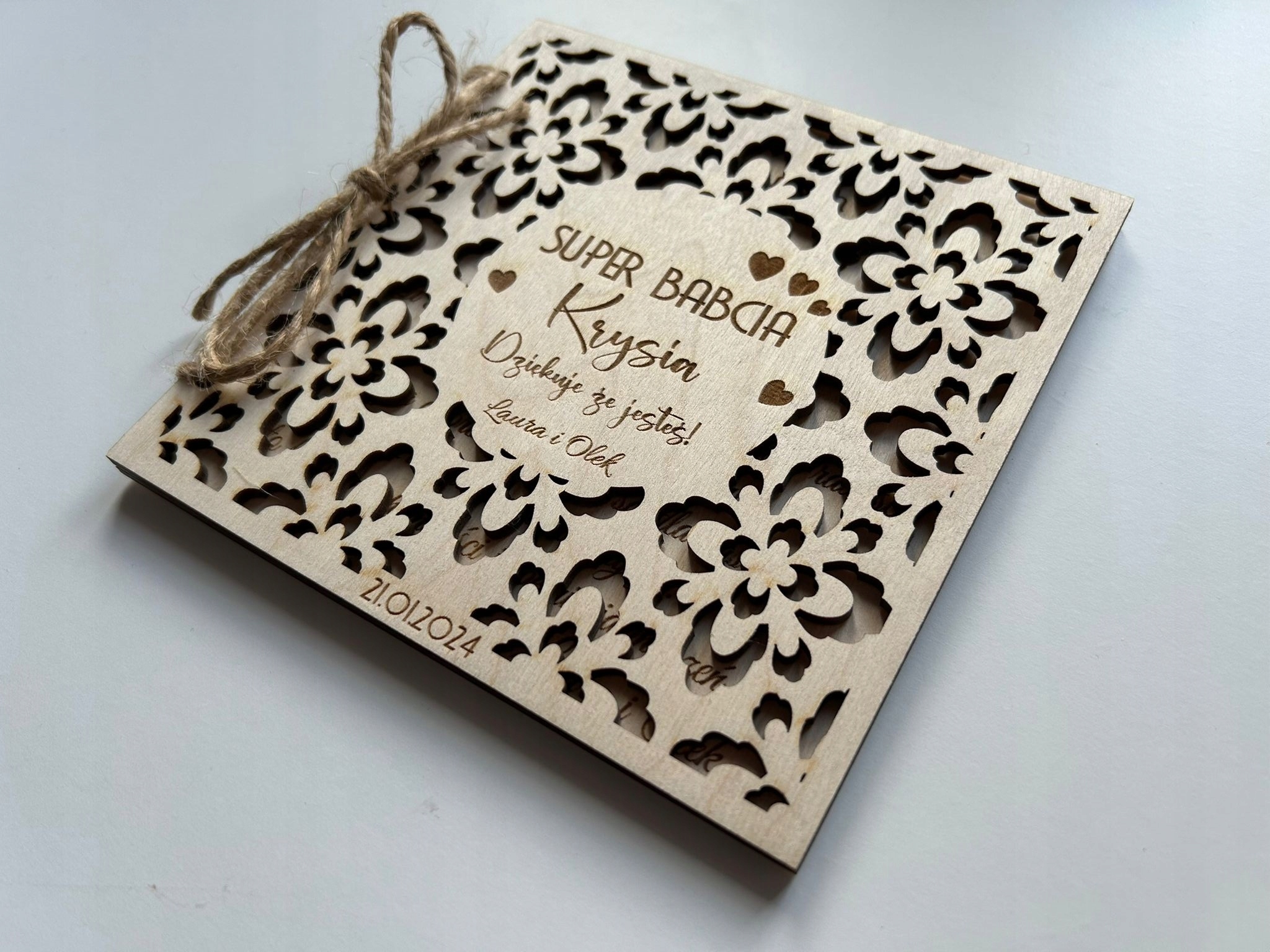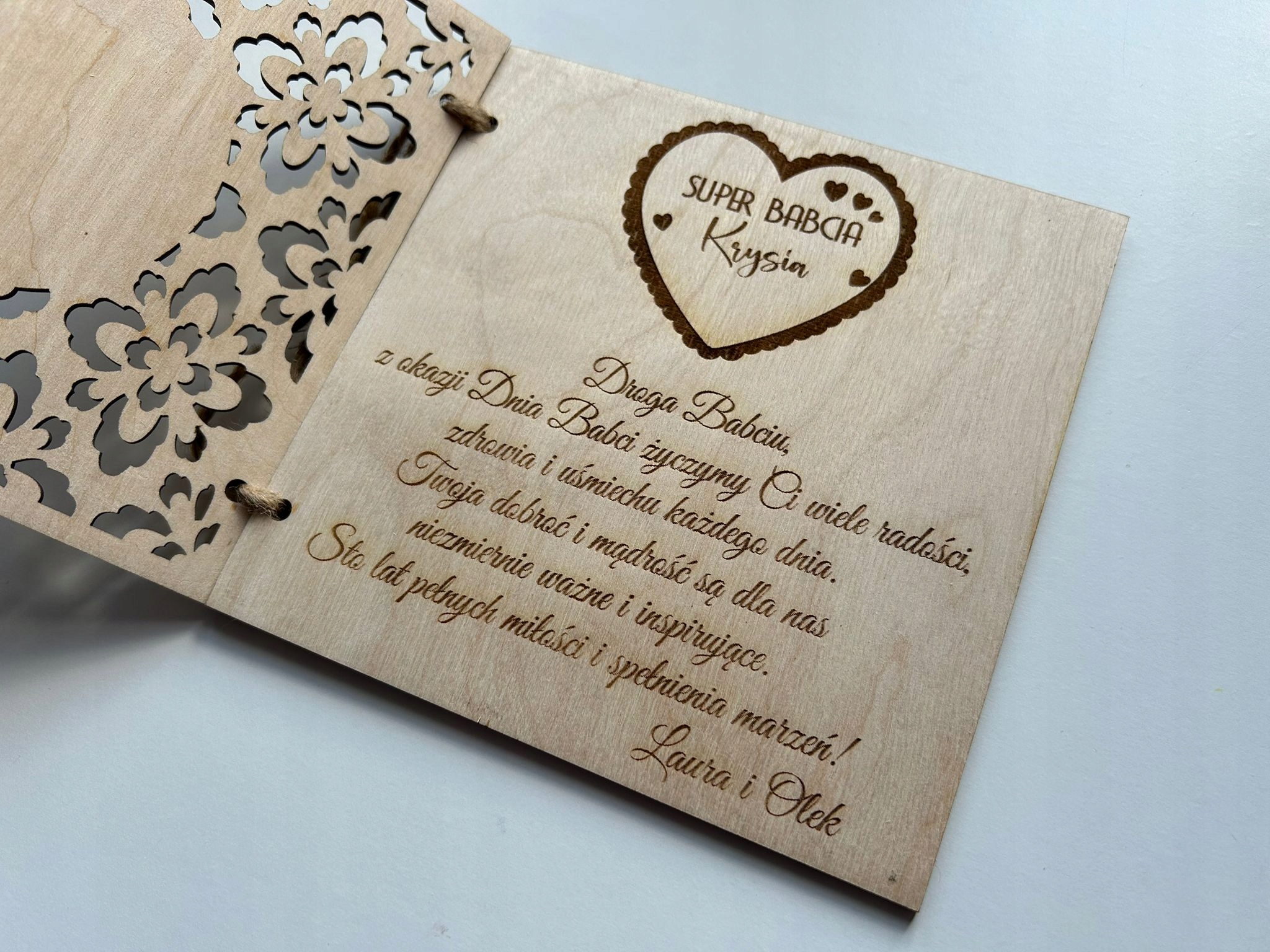Wyjątkowa otwierana drewniana ażurowa Kartka z okazji Dnia Babci.