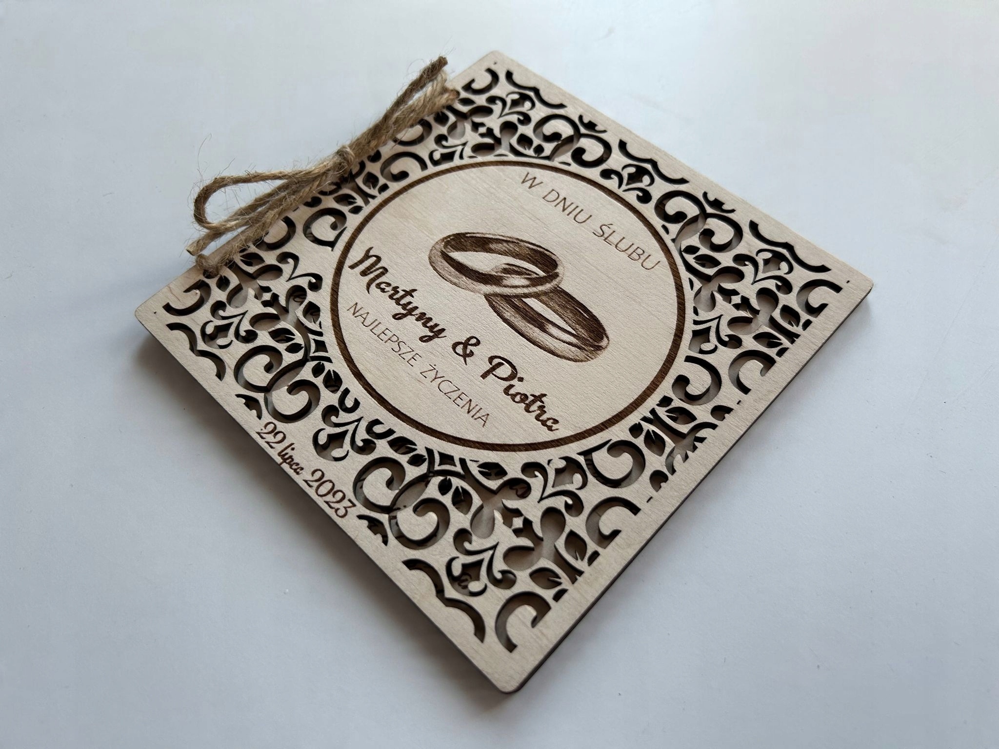 KARTKA ŚLUBNA DREWNIANA PERSONALIZOWANA PREZENT PAMIĄTKA KOPERTA Grawer ŚLUB