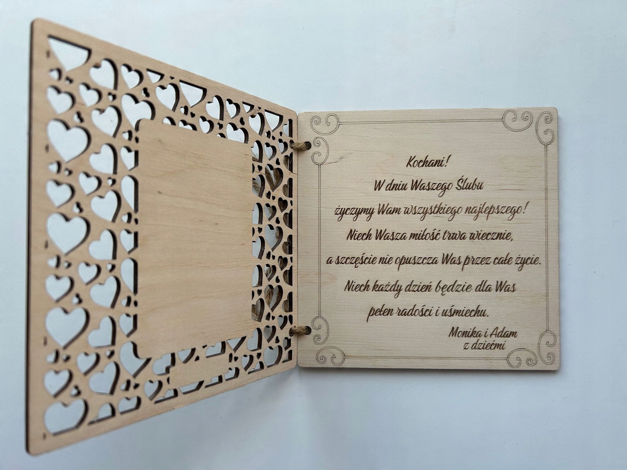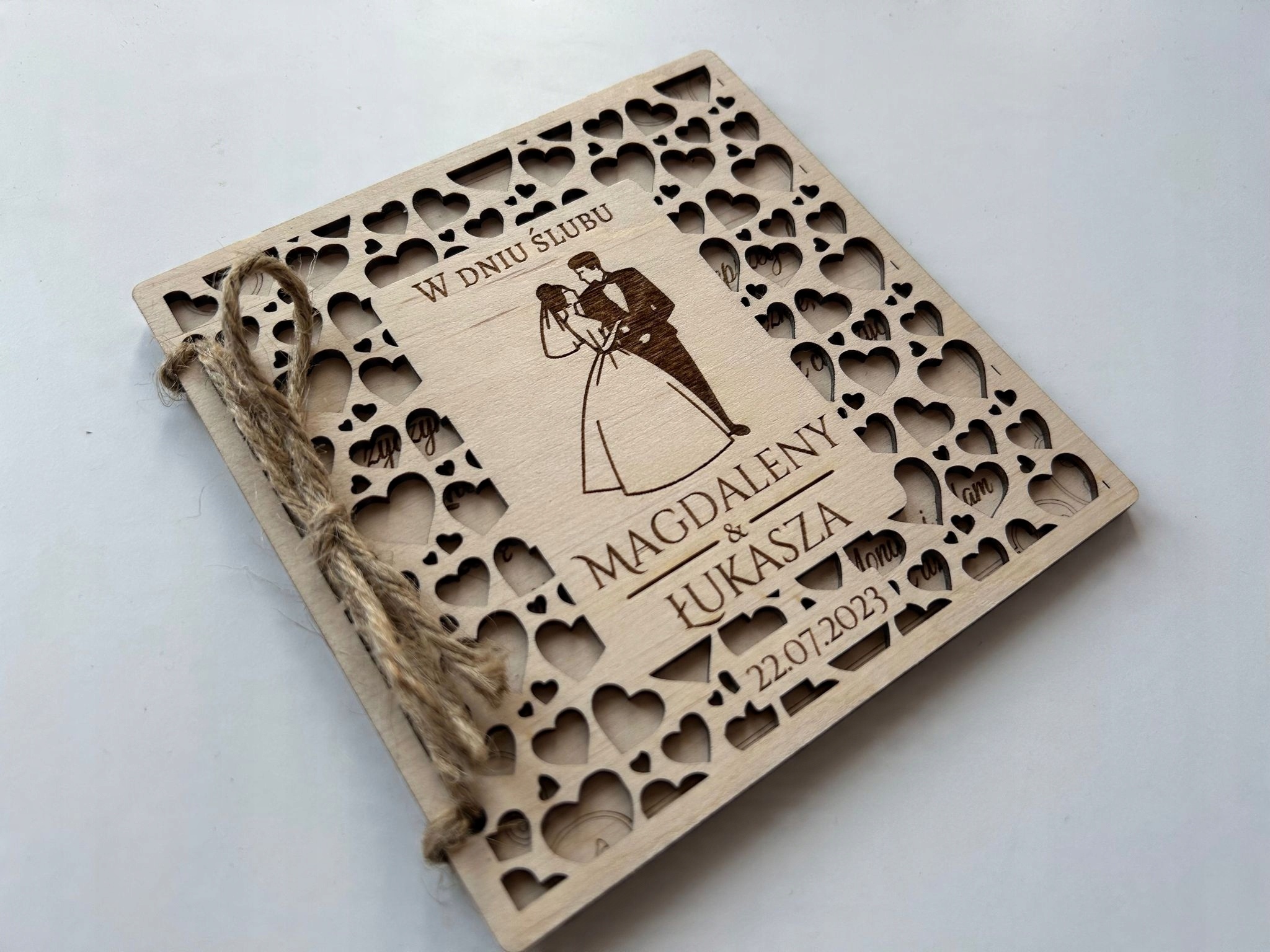 KARTKA ŚLUBNA DREWNIANA PERSONALIZOWANA PREZENT PAMIĄTKA KOPERTA Grawer ŚLUB