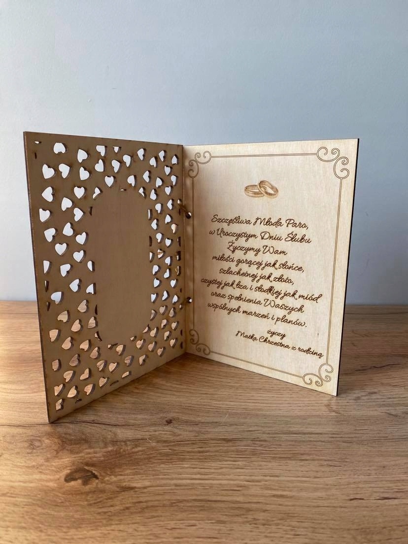 KARTKA ŚLUBNA DREWNIANA PERSONALIZOWANA PREZENT PAMIĄTKA KOPERTA Grawer ŚLUB