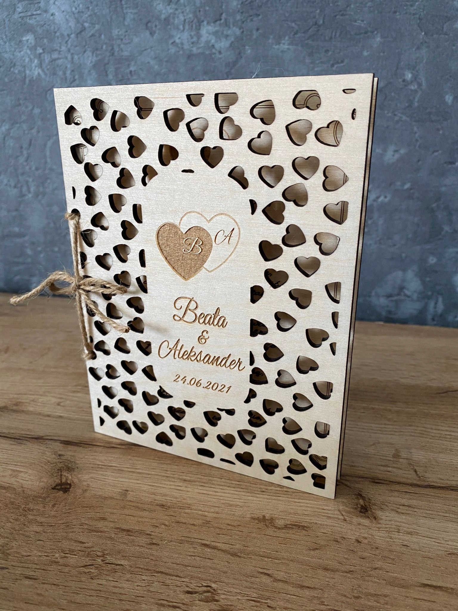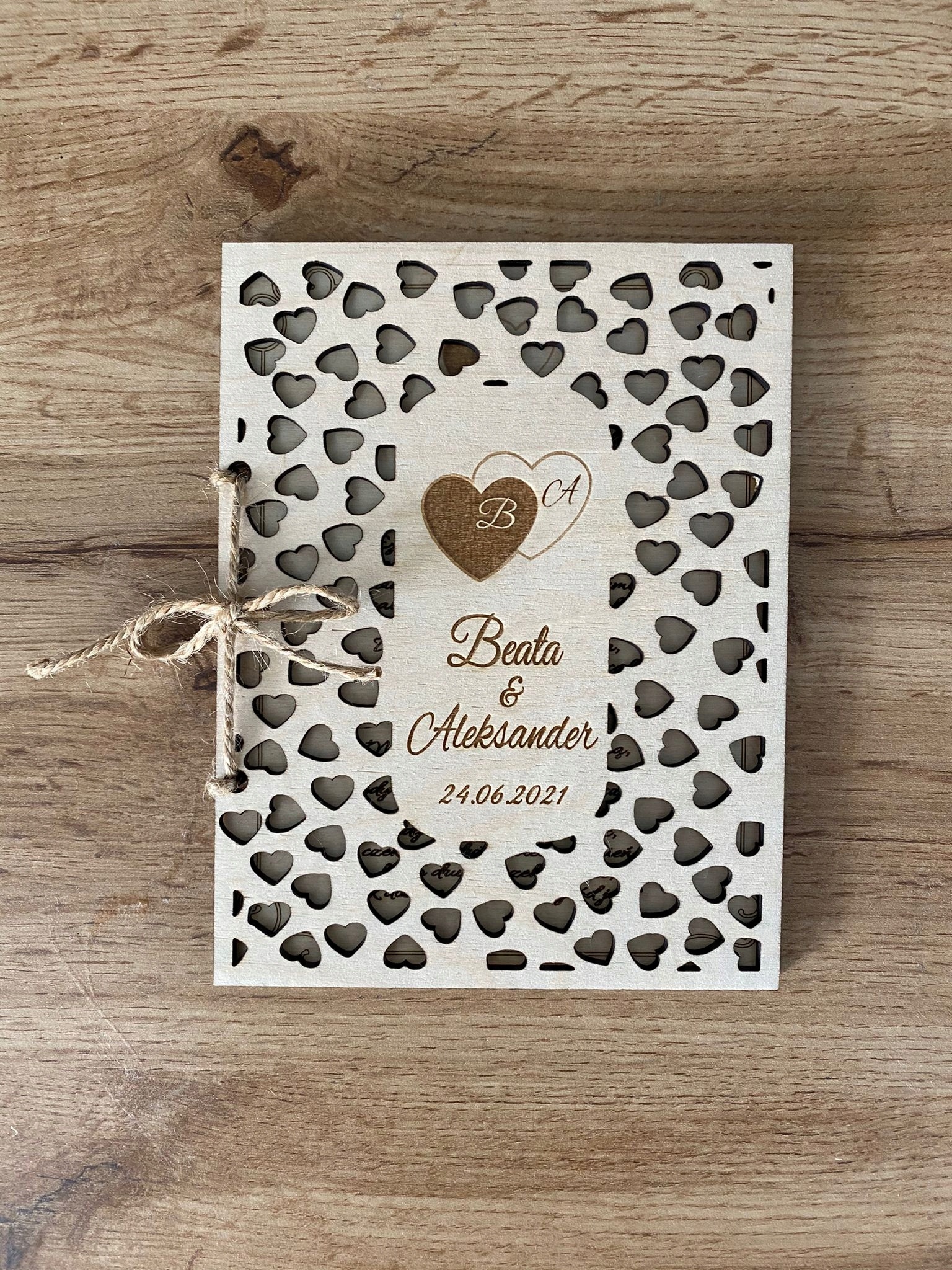 Karta zdobiona głębokim grawerem laserowym w postaci SERC z inicjałem oraz podpisem ” (Imiona Pary Młodej + data Ślubu) ” (WZÓR OKREŚLONY wg. zdjęcia po lewej stronie).