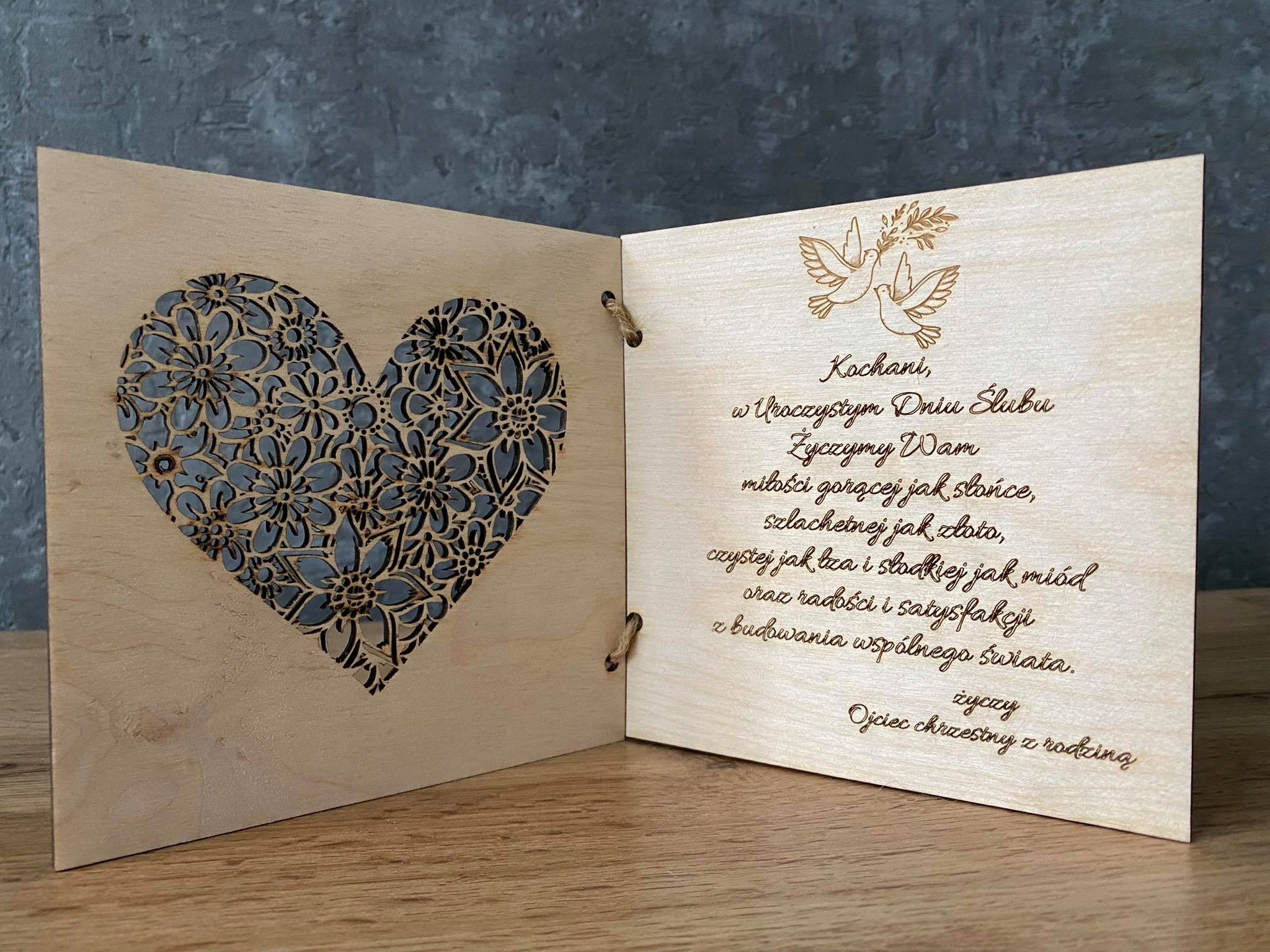 KARTKA ŚLUBNA DREWNIANA PERSONALIZOWANA PREZENT PAMIĄTKA KOPERTA Grawer ŚLUB