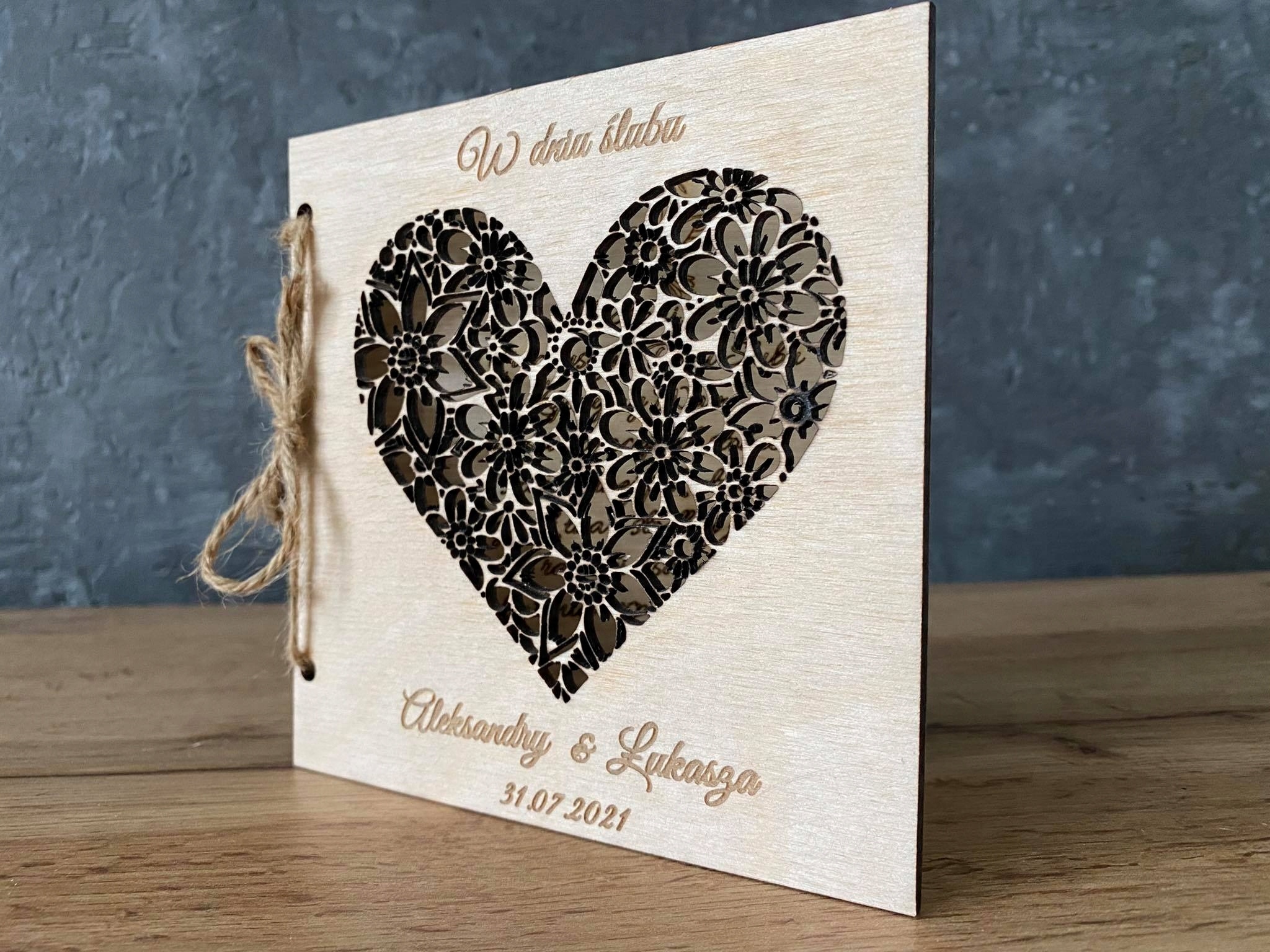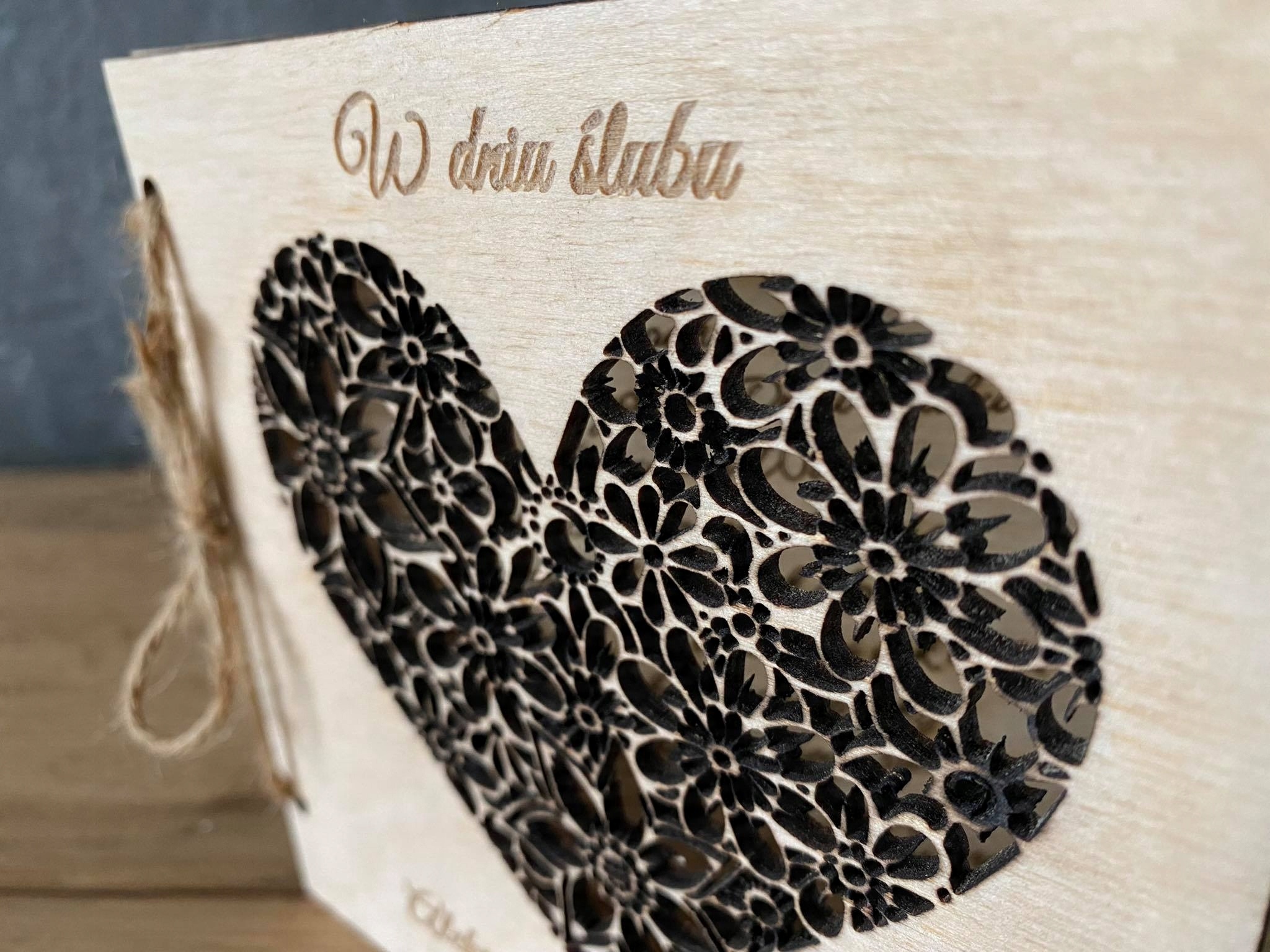 Karta zdobiona głębokim grawerem laserowym w postaci SERCA AŻUROWEGO oraz podpisem ” W dniu ślubu (Imiona Pary Młodej + data Ślubu) ” (WZÓR OKREŚLONY wg. zdjęcia po lewej stronie).