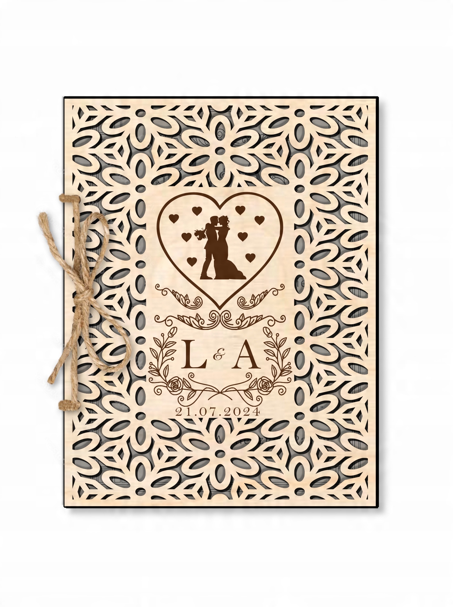 Karta zdobiona głębokim grawerem laserowym w postaci Młodej Pary oraz podpisem ” W dniu ślubu (Imiona Pary Młodej + data Ślubu) ” (WZÓR OKREŚLONY wg. zdjęcia po lewej stronie).