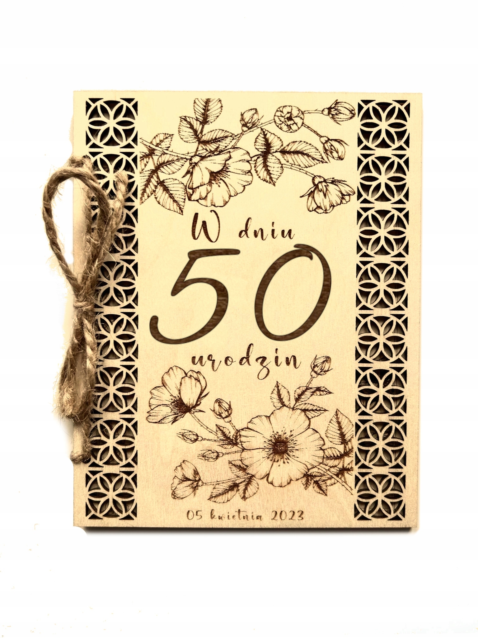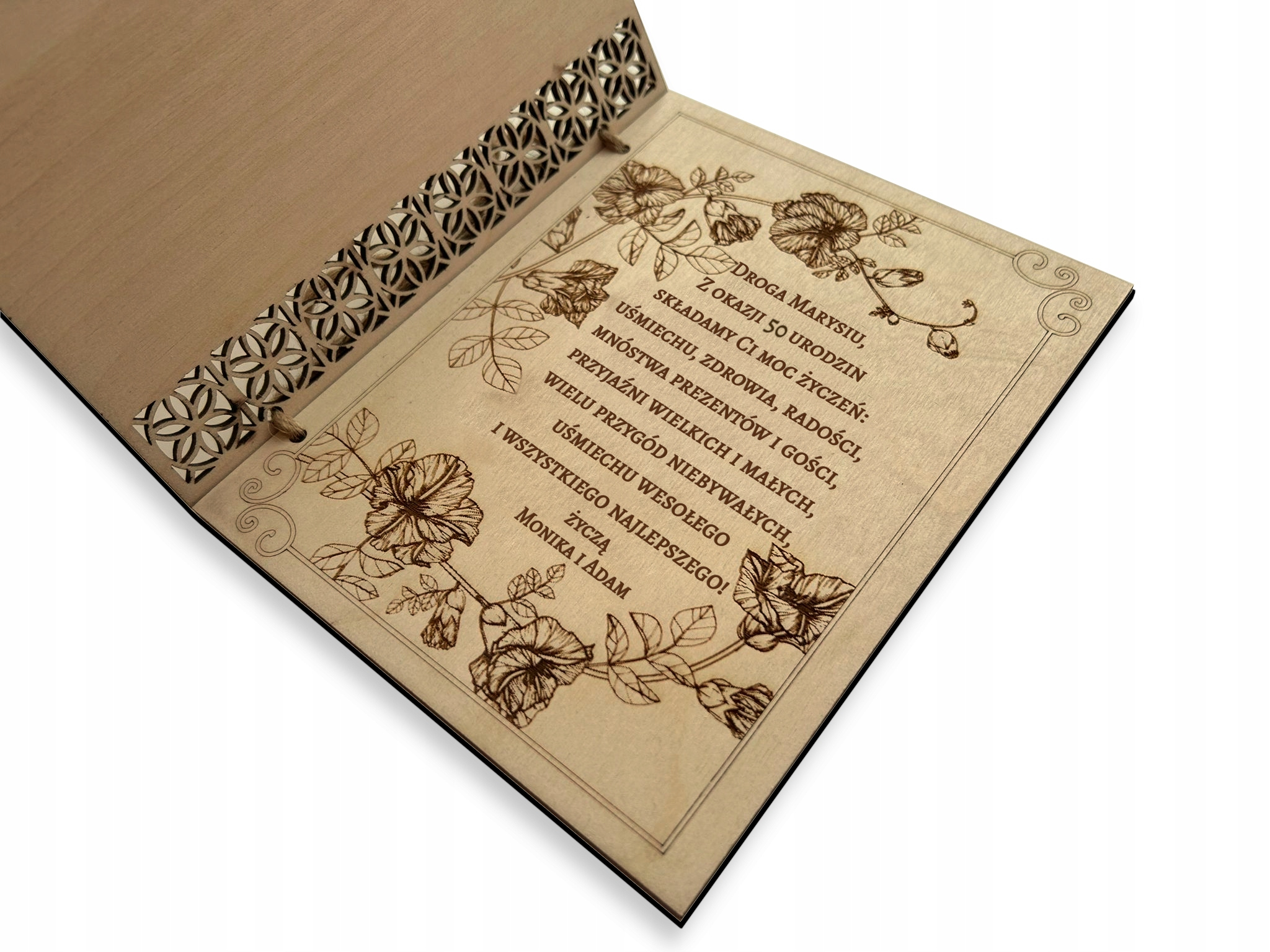 Karta zdobiona głębokim grawerem laserowym w postaci napisu ” W dniu 50 urodzin + data uroczystości” (WZÓR OKREŚLONY wg. zdjęcia po lewej stronie).