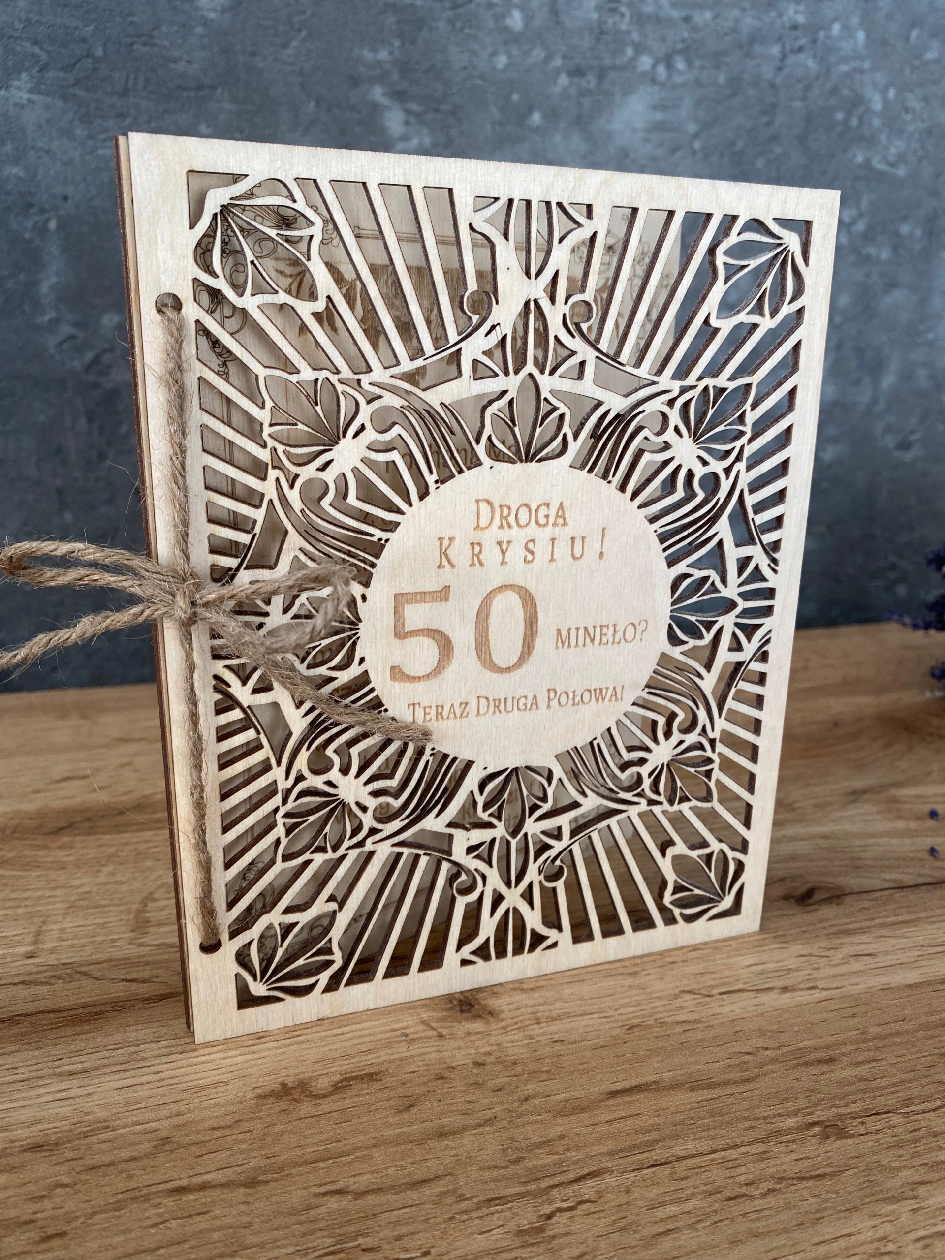 Karta zdobiona głębokim grawerem laserowym w postaci napisu np.” Droga Krysiu! 50 minęło? Teraz druga połowa! (WZÓR OKREŚLONY wg. zdjęcia po lewej stronie).