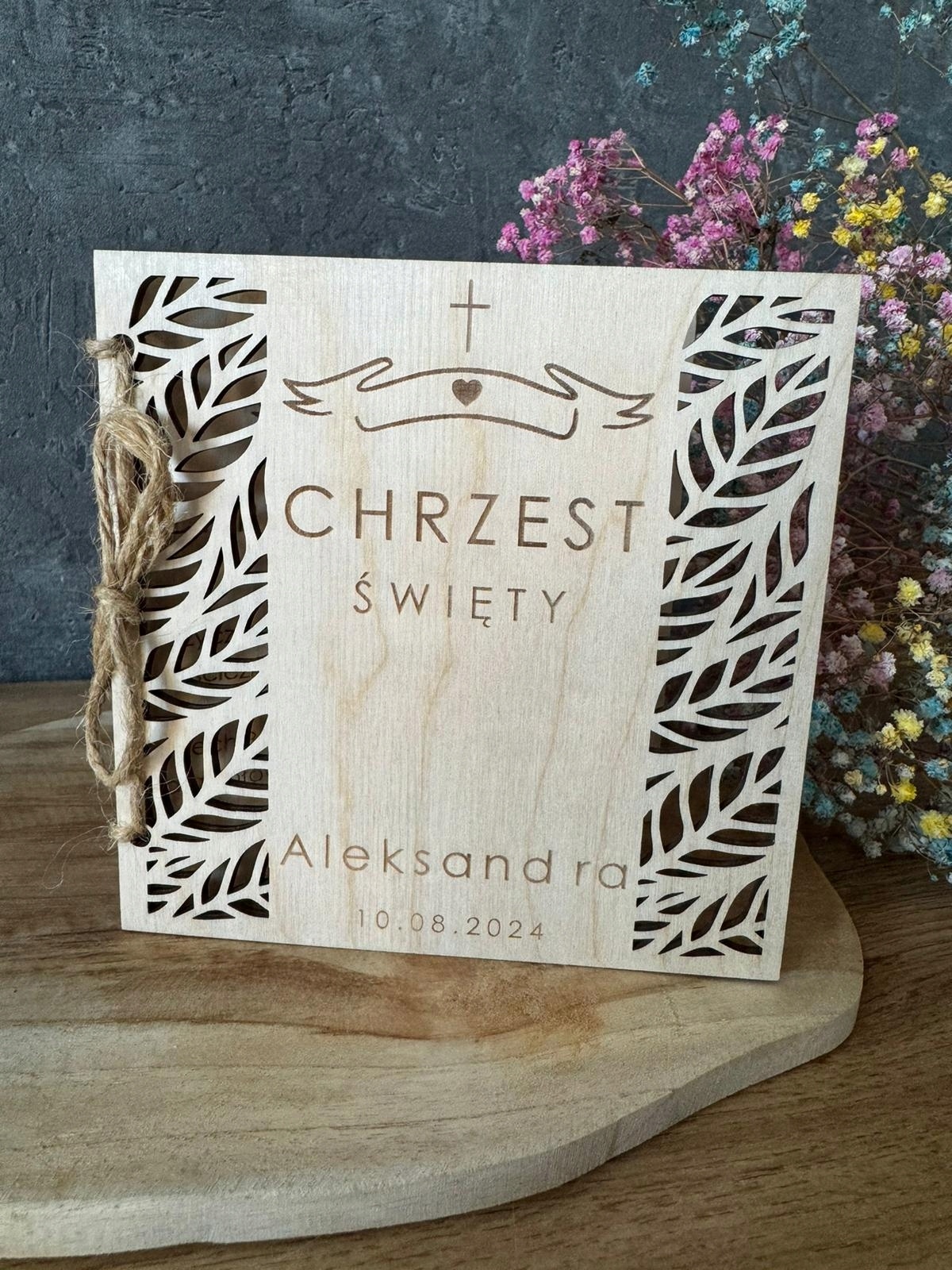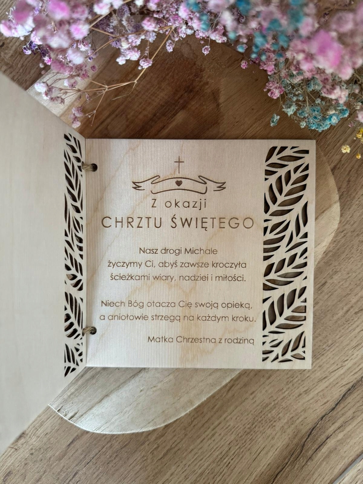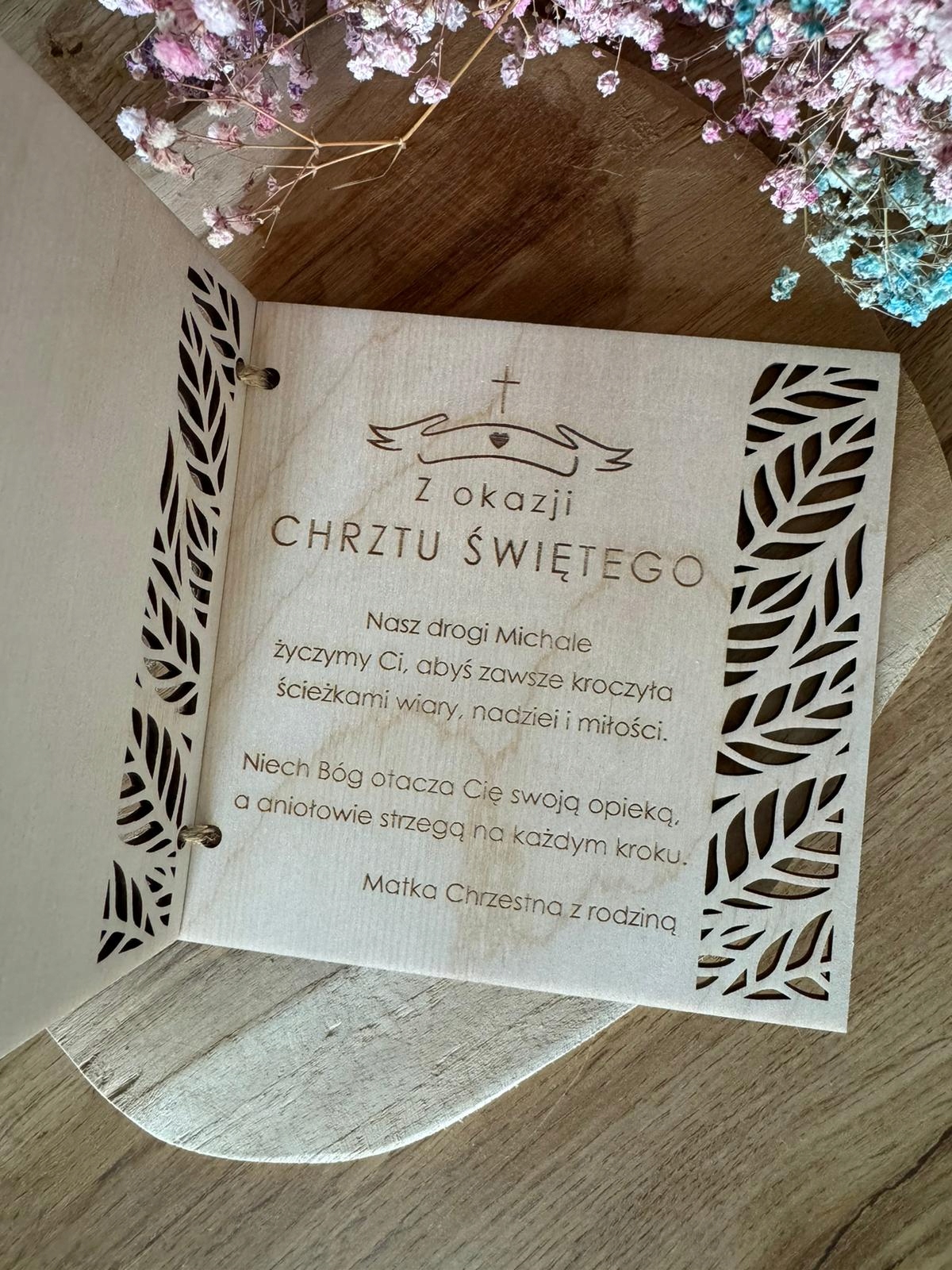 Karta zdobiona głębokim grawerem laserowym w postaci grafiki z podpisem ” PAMIĄTKA CHRZTU ŚWIĘTEGO ” (WZÓR OKREŚLONY wg. zdjęcia ).