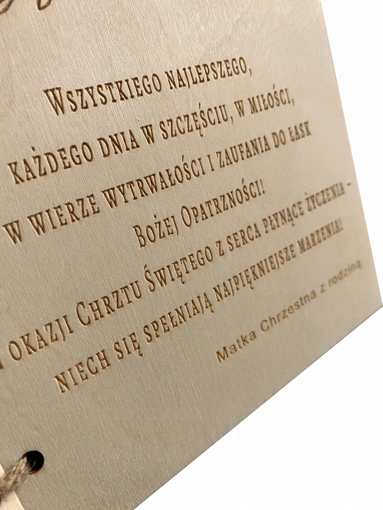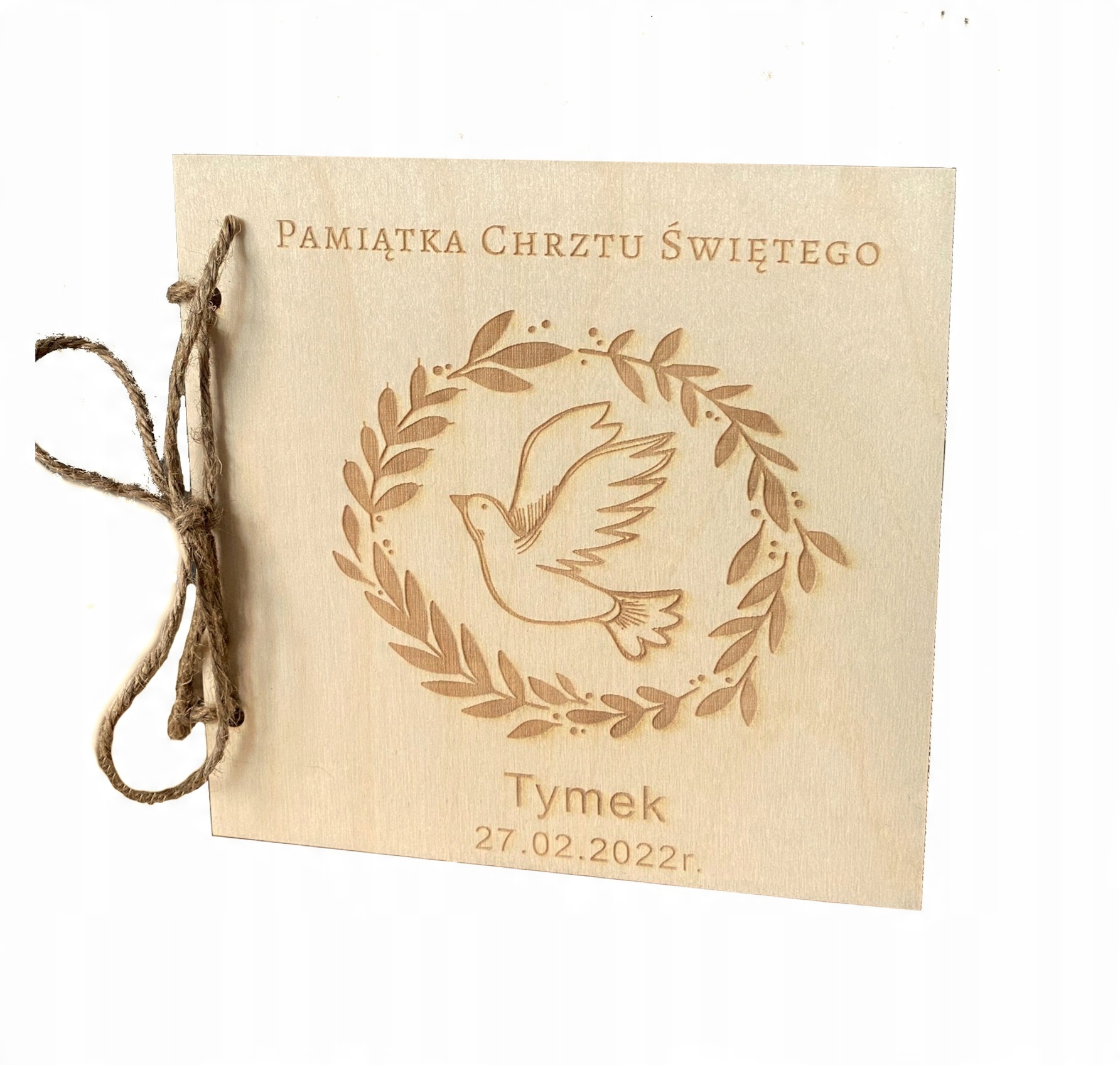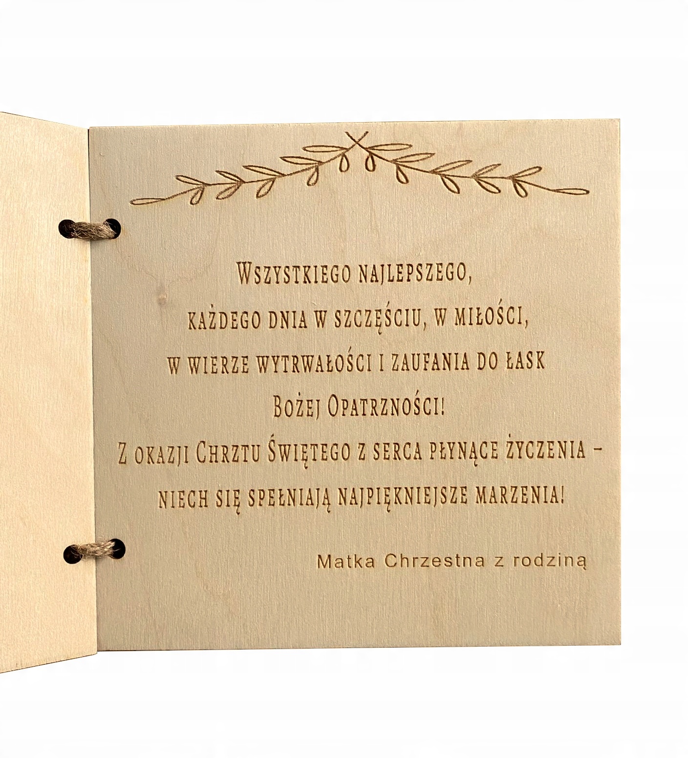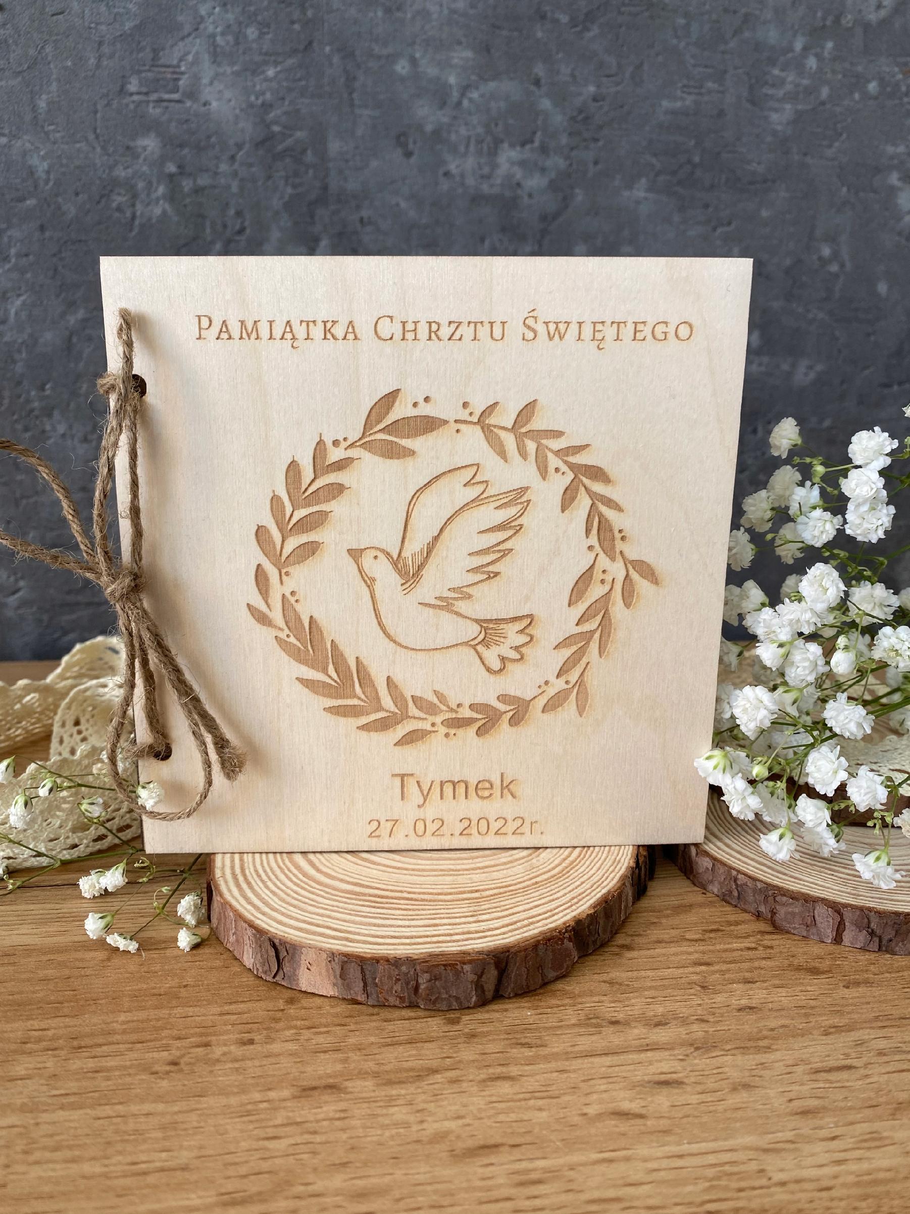 Karta zdobiona głębokim grawerem laserowym w postaci GRAFIKI , tekstu ” Pamiątka Chrztu świętego” (WZÓR OKREŚLONY wg. zdjęcia po lewej stronie), oraz podpisu ” Imię dziecka + data Chrztu Świętego) wykonana z należytą starannością i dbałością o każdy szczegół. Wewnątrz znajduje się kartka grawerowana laserowo z grafiką i życzeniami spersonalizowana przez Państwa lub z gotowego projektu. tj.: