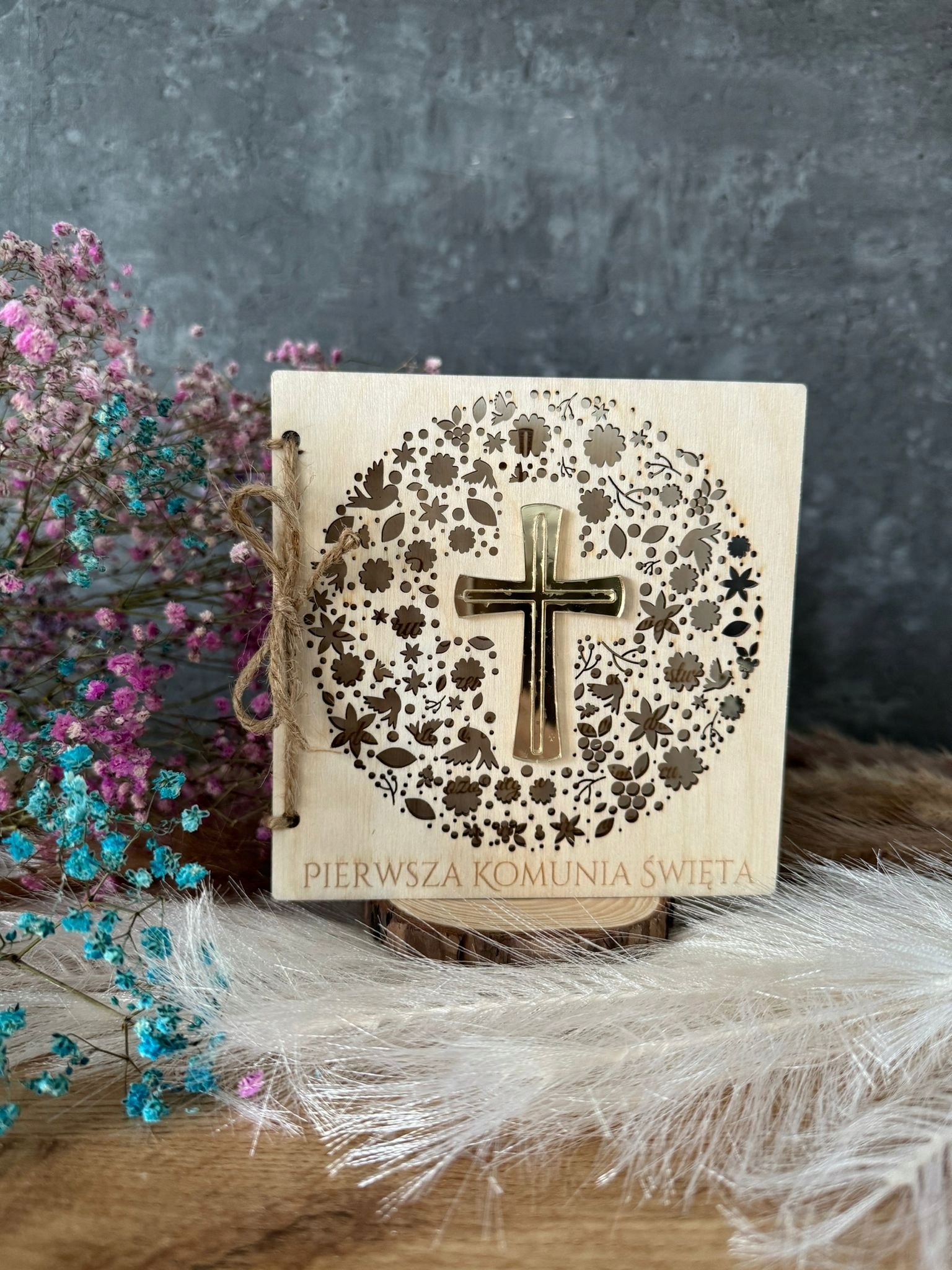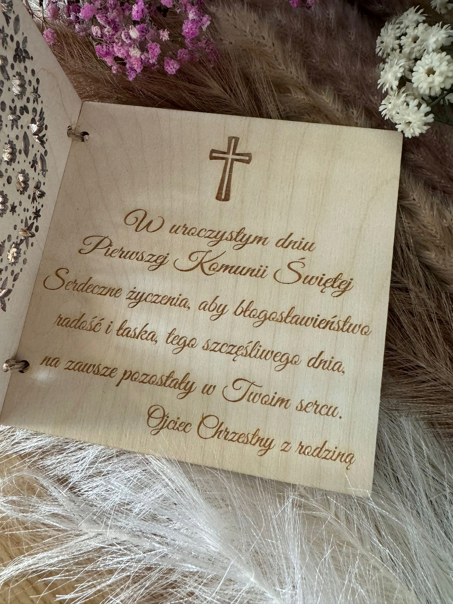 Książeczka zdobiona głębokim grawerem laserowym z podpisem ” PIERWSZA KOMUNIA ŚWIĘTA ” (WZÓR OKREŚLONY wg. zdjęcia po lewej stronie).