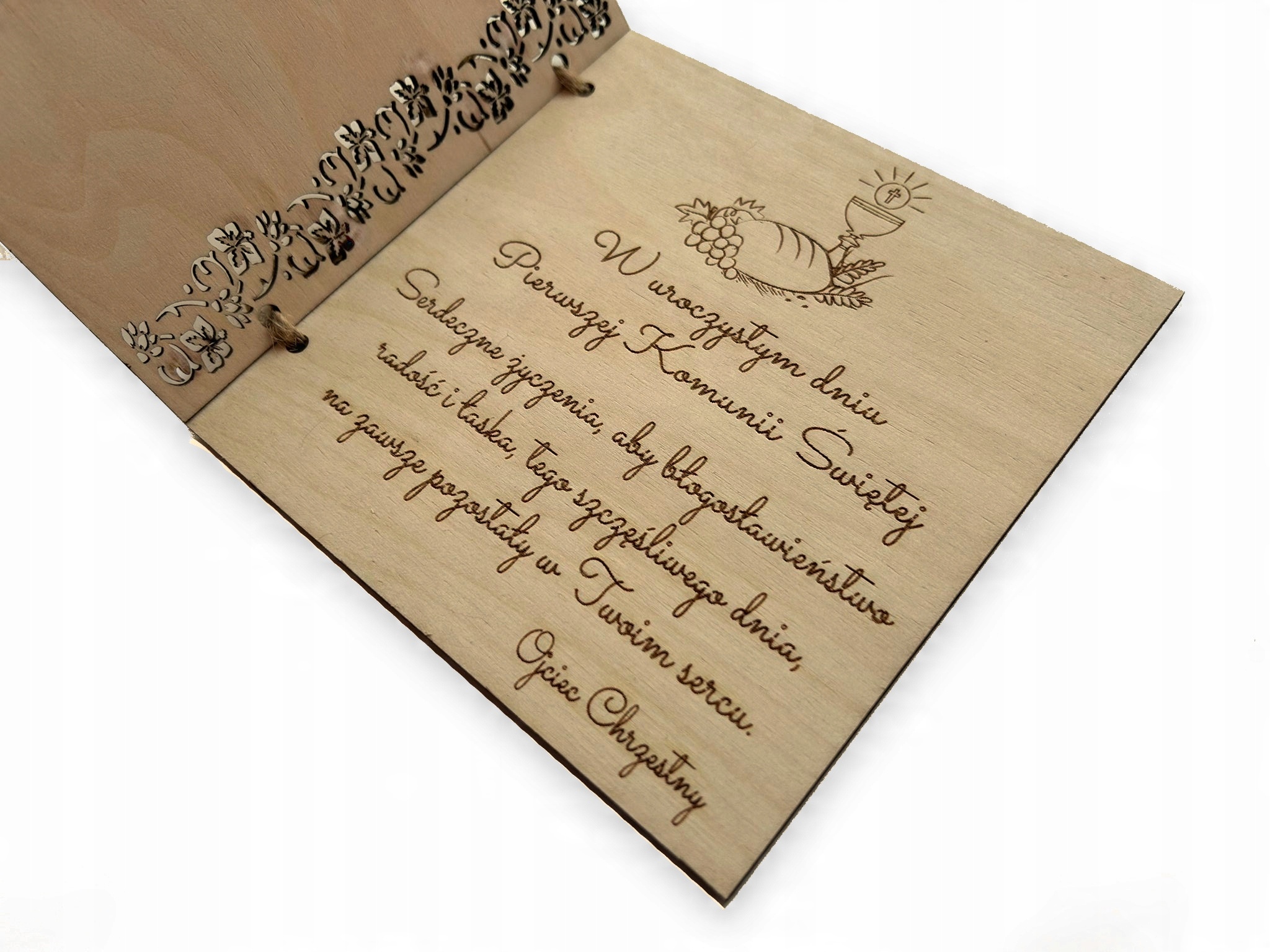 Książeczka zdobiona głębokim grawerem laserowym z podpisem ” Pamiątka Pierwszej Komunii Świętej (IMIĘ DZIECKA + data Komunii Świętej) ” (WZÓR OKREŚLONY wg. zdjęcia po lewej stronie).