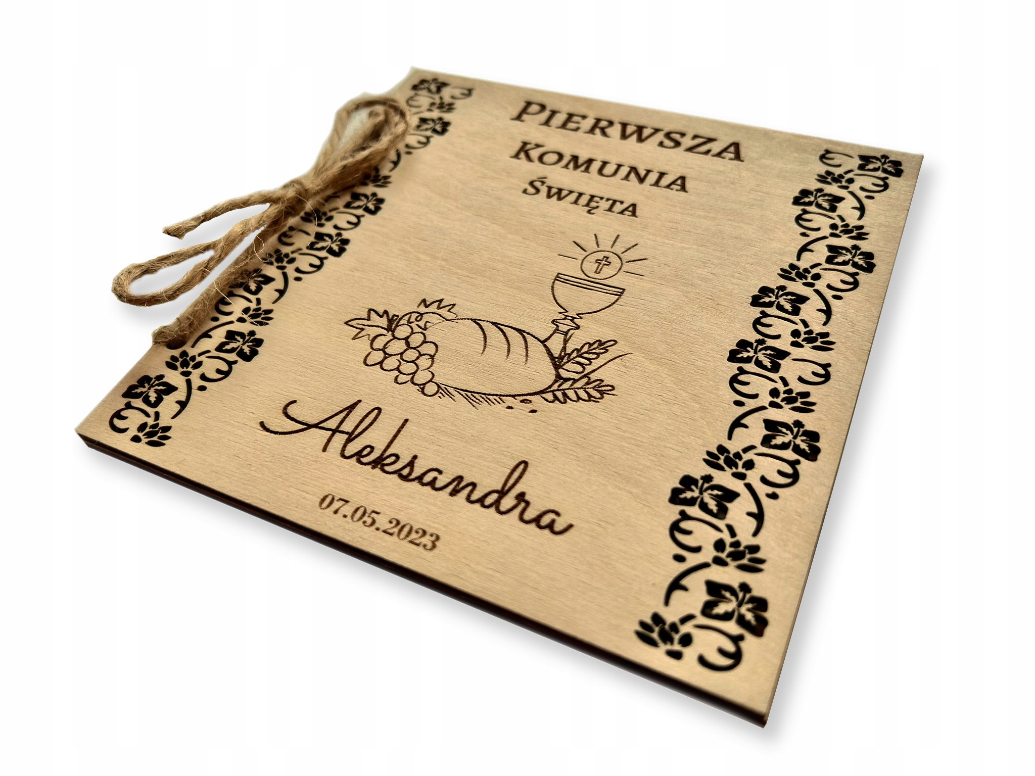 Książeczka zdobiona głębokim grawerem laserowym z podpisem ” Pamiątka Pierwszej Komunii Świętej (IMIĘ DZIECKA + data Komunii Świętej) ” (WZÓR OKREŚLONY wg. zdjęcia po lewej stronie).
