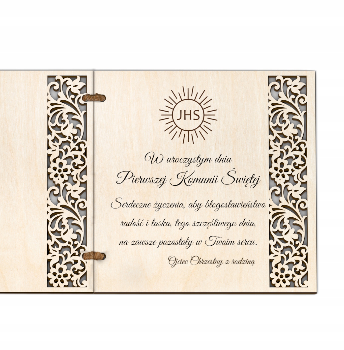 Wykonana z należytą starannością i dbałością o każdy szczegół. Wewnątrz znajduje się kartka grawerowana laserowo z życzeniami spersonalizowana przez Państwa lub z gotowego projektu tj.: