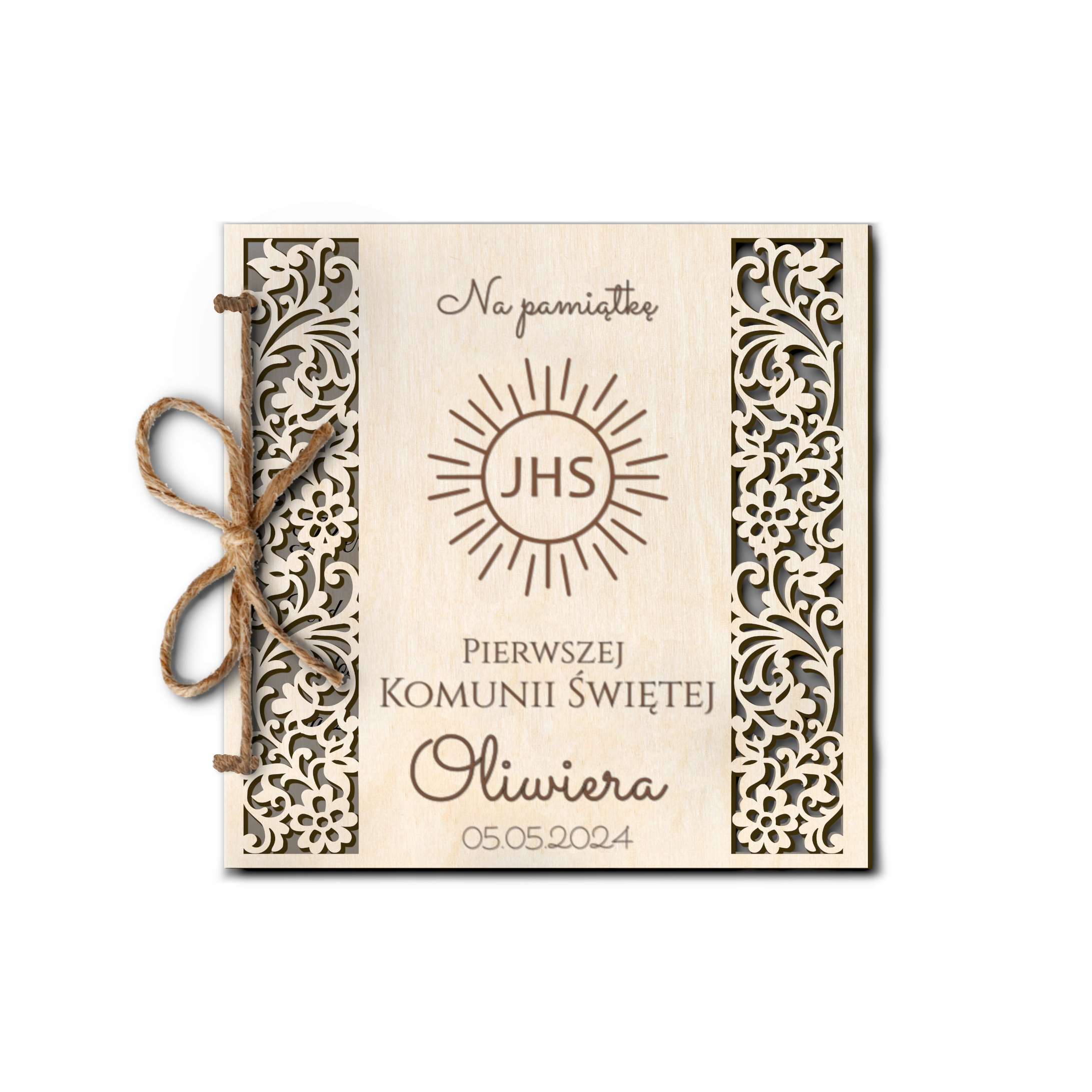 Książeczka zdobiona głębokim grawerem laserowym z podpisem ” Na pamiątkę Pierwszej Komunii Świętej (IMIĘ DZIECKA + data Komunii Świętej ” (WZÓR OKREŚLONY wg. zdjęcia po lewej stronie).
