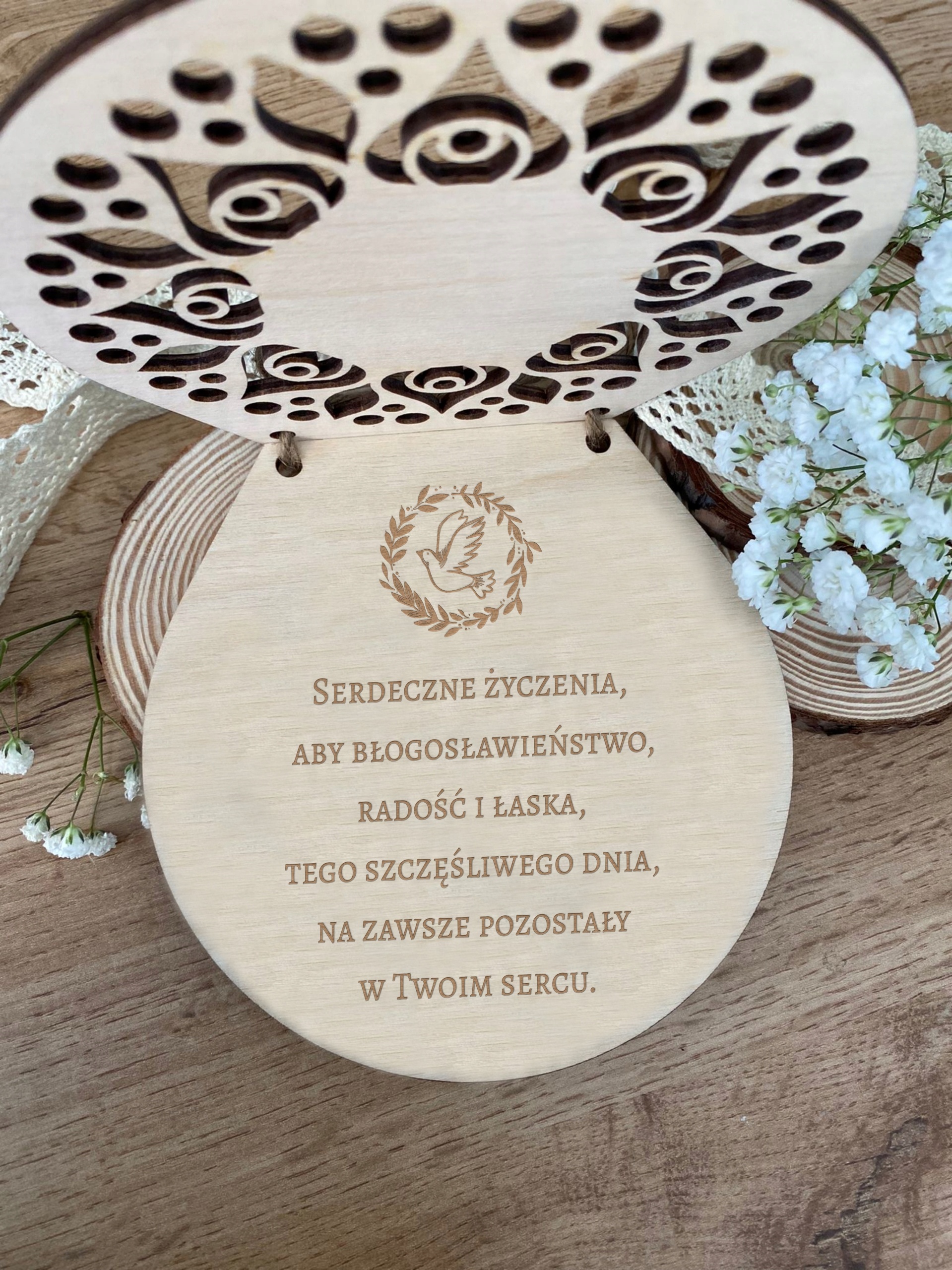 Wykonana z należytą starannością i dbałością o każdy szczegół. Wewnątrz znajduje się kartka grawerowana laserowo z życzeniami: