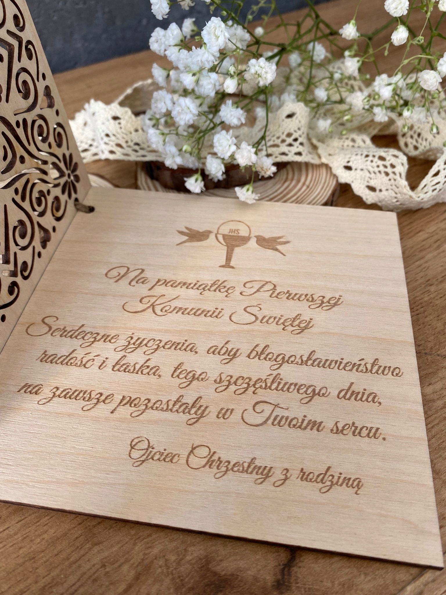 Karta zdobiona głębokim grawerem laserowym w postaci Hostii oraz dwóch Gołębic z podpisem ” Pierwsza Komunia Święta (IMIĘ DZIECKA + data Komunii Świętej) ” (WZÓR OKREŚLONY wg. zdjęcia po lewej stronie).