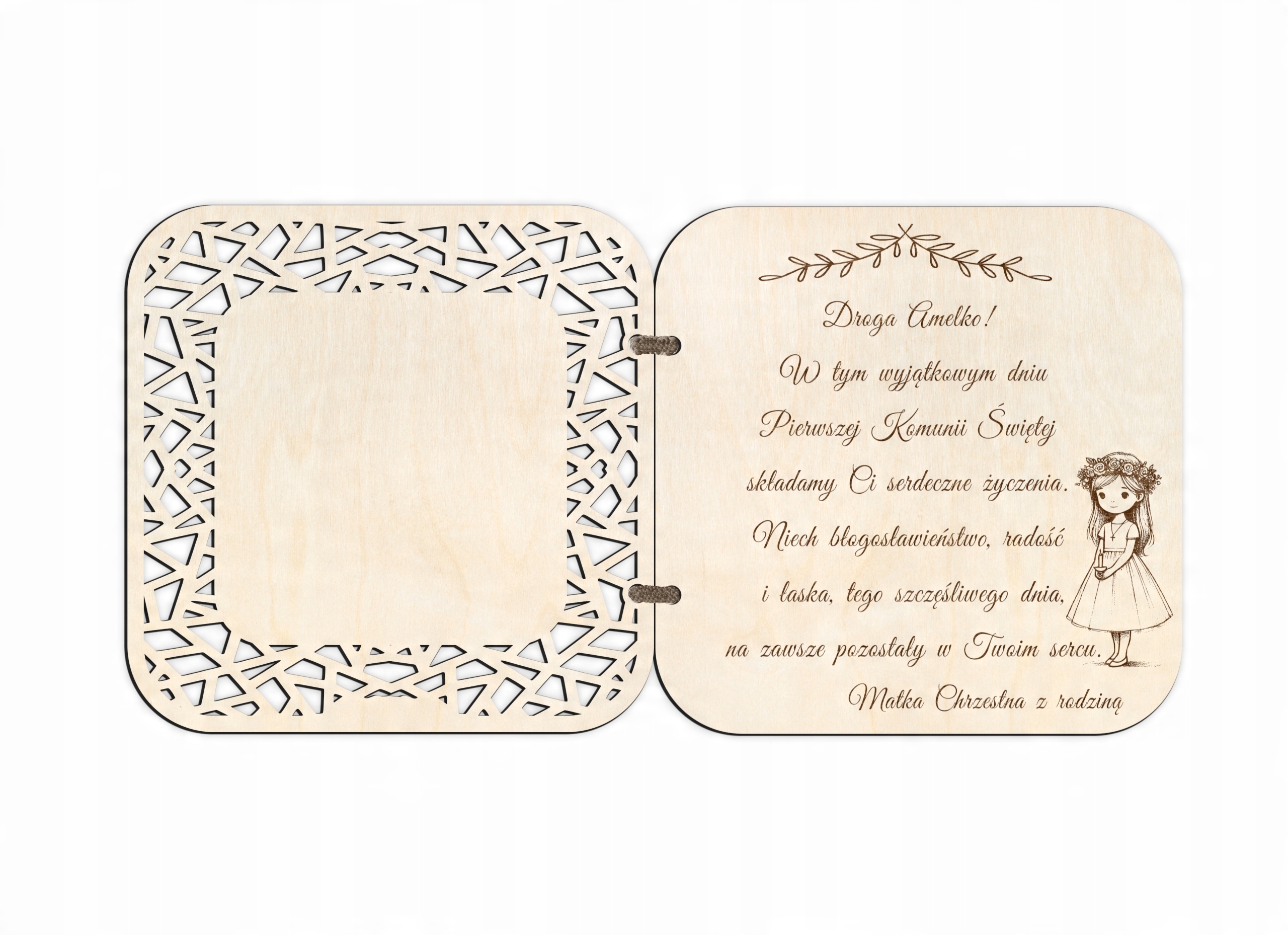 Karta zdobiona głębokim grawerem laserowym w postaci grafiki oraz podpisu ” Pierwsza Komunia Święta (IMIĘ DZIECKA + data Komunii Świętej) ” (WZÓR OKREŚLONY wg. zdjęcia po lewej stronie).