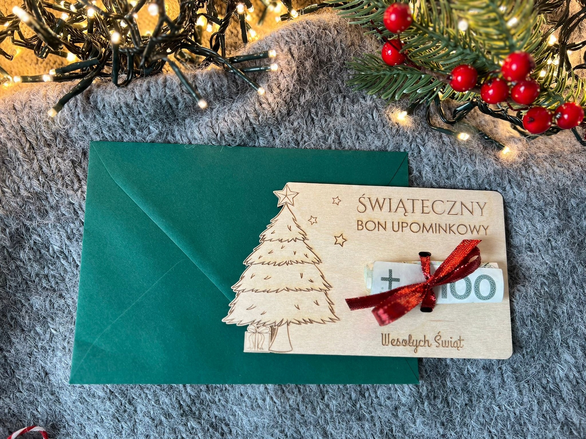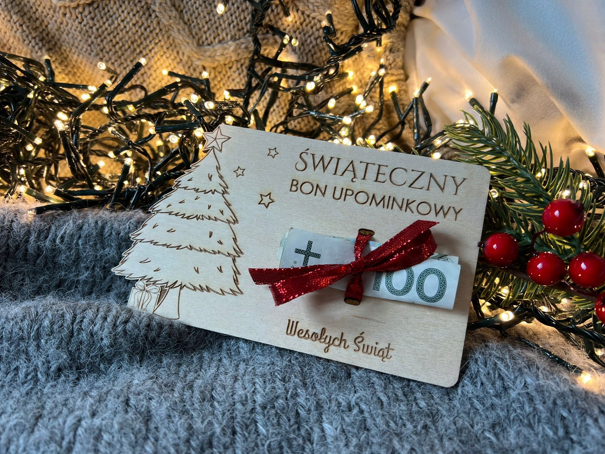 Czasami możliwość samodzielnego wyboru prezentu to najlepszy prezent , ale co zrobić by pieniądze nabrały nieco świątecznego klimatu? Najlepiej je przyozdobić w tematyczny sposób np. przywiązując je na VOUCHER KARTA lub BON PODARUNKOWY wykonany z DREWNA. Podarowanie pieniędzy w taki sposób to na pewno nie będzie „pójście na łatwiznę”, a tego rodzaju prezent zostanie w pamięci bliskiej Ci osoby.