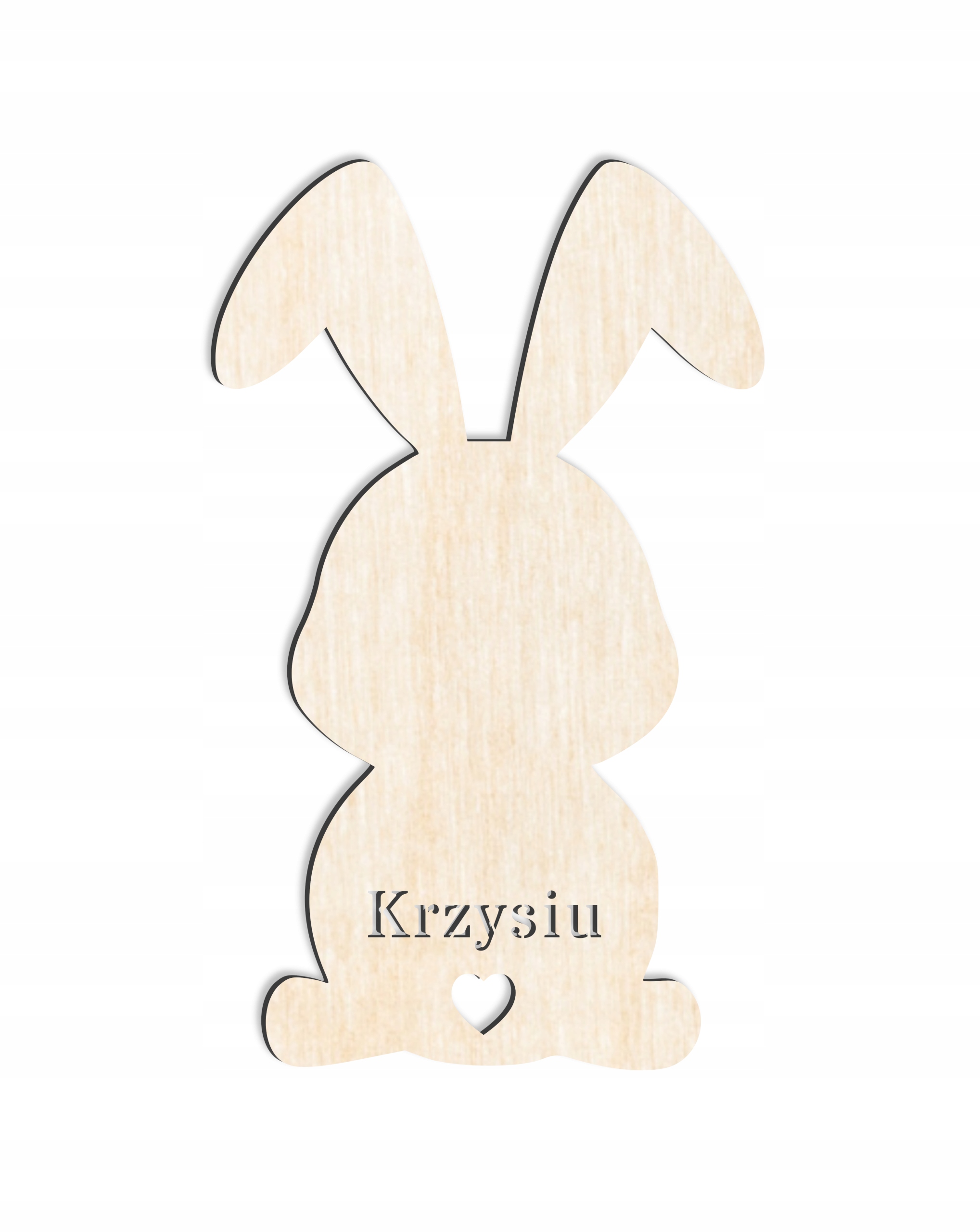 Drewniana ozdoba personalizowana z imieniem dziecka w kształcie króliczka wielkanocnego. Imię dziecka jest wycinane laserowo. Uwzględniam polskie znaki. Czcionka tylu STENCIL.