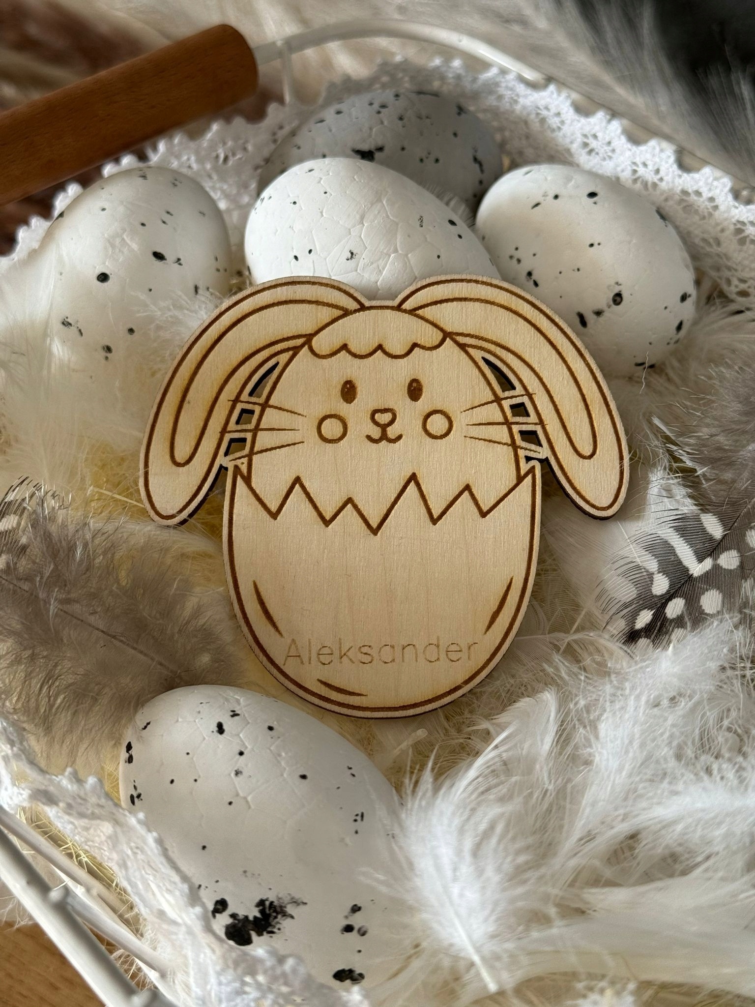 Imiennik wielkanocny z grafiką zajączka wykonany z wysokiej klasy sklejki brzozowej dwustronnie szlifowanej, w kolorze naturalnego drewna.