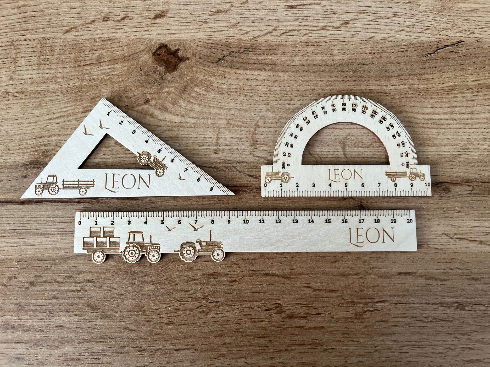 Zestaw przyrządów geometrycznych z motywem TRAKTORÓW z dowolnym wygrawerowanym imieniem dziecka.