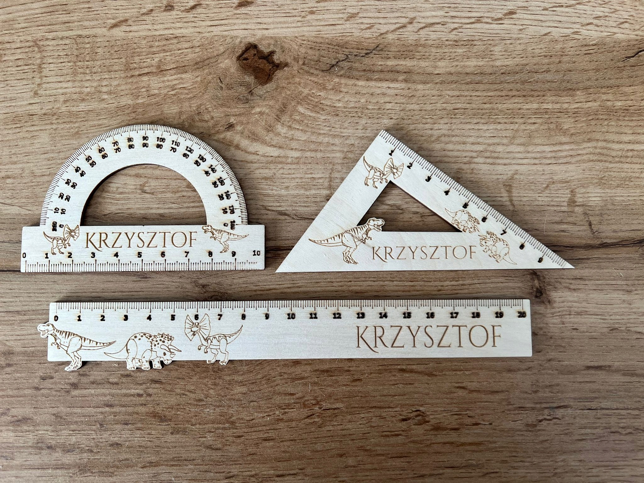 Zestaw przyrządów geometrycznych z motywem DINOSAURÓW z dowolnym wygrawerowanym imieniem dziecka.